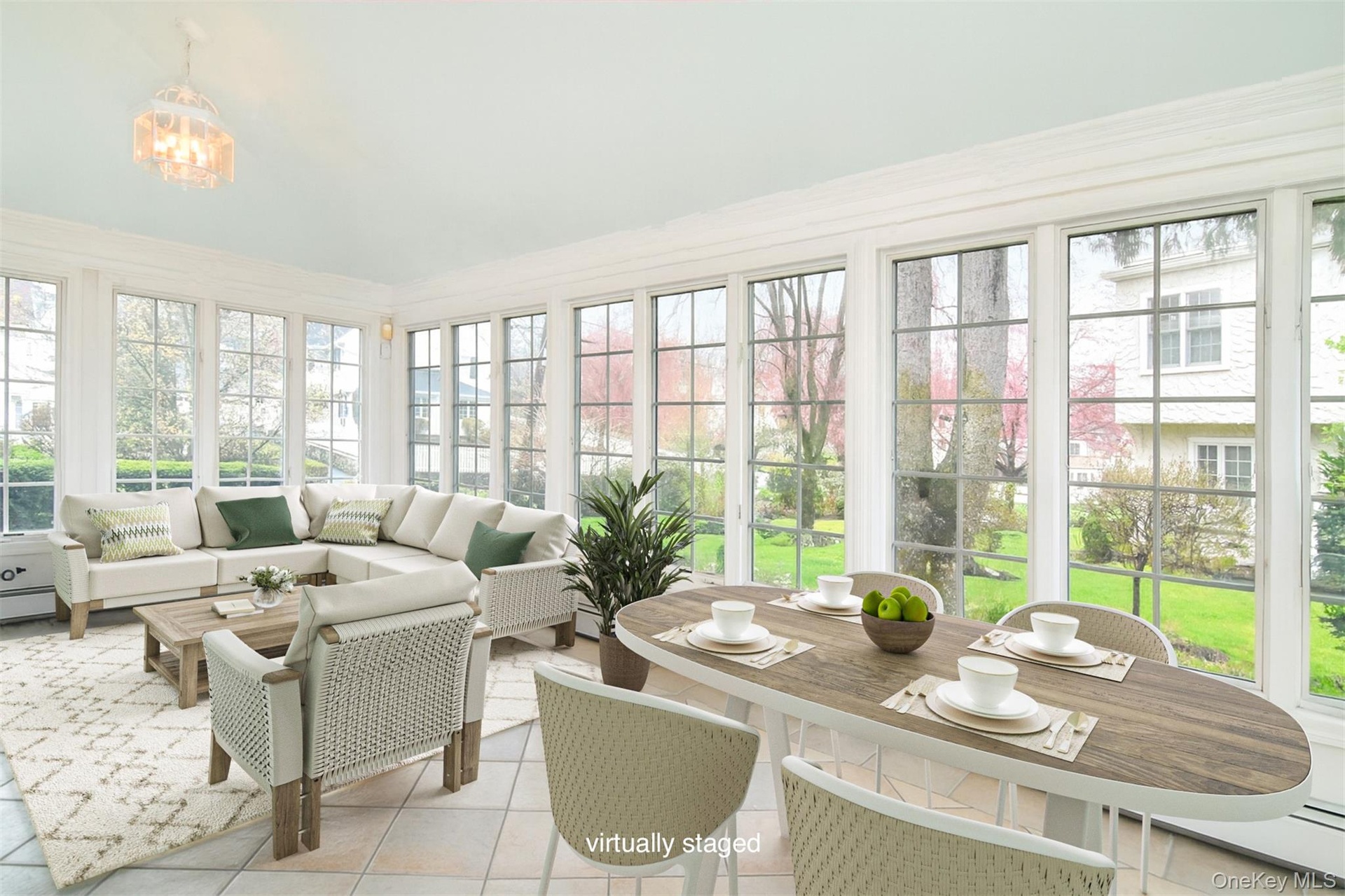- Sunroom featuring tile patterned floors and a chandelier