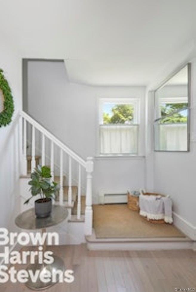 - Living room featuring a baseboard radiator and wood finished floors