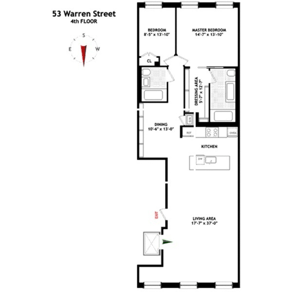 Step directly into style. This sprawling 2-bed, 2-bath full-floor loft at 53 Warren Street serves up 1,562 sq. ft. of downtown elegance—complete with soaring 12’ ceilings, wide-plank Ipe Brazilian hardwood floors, and oversized windows that flood the space with natural light. A private keyed elevator opens into an expansive 37’ great room, made for effortless entertaining and everyday luxe.