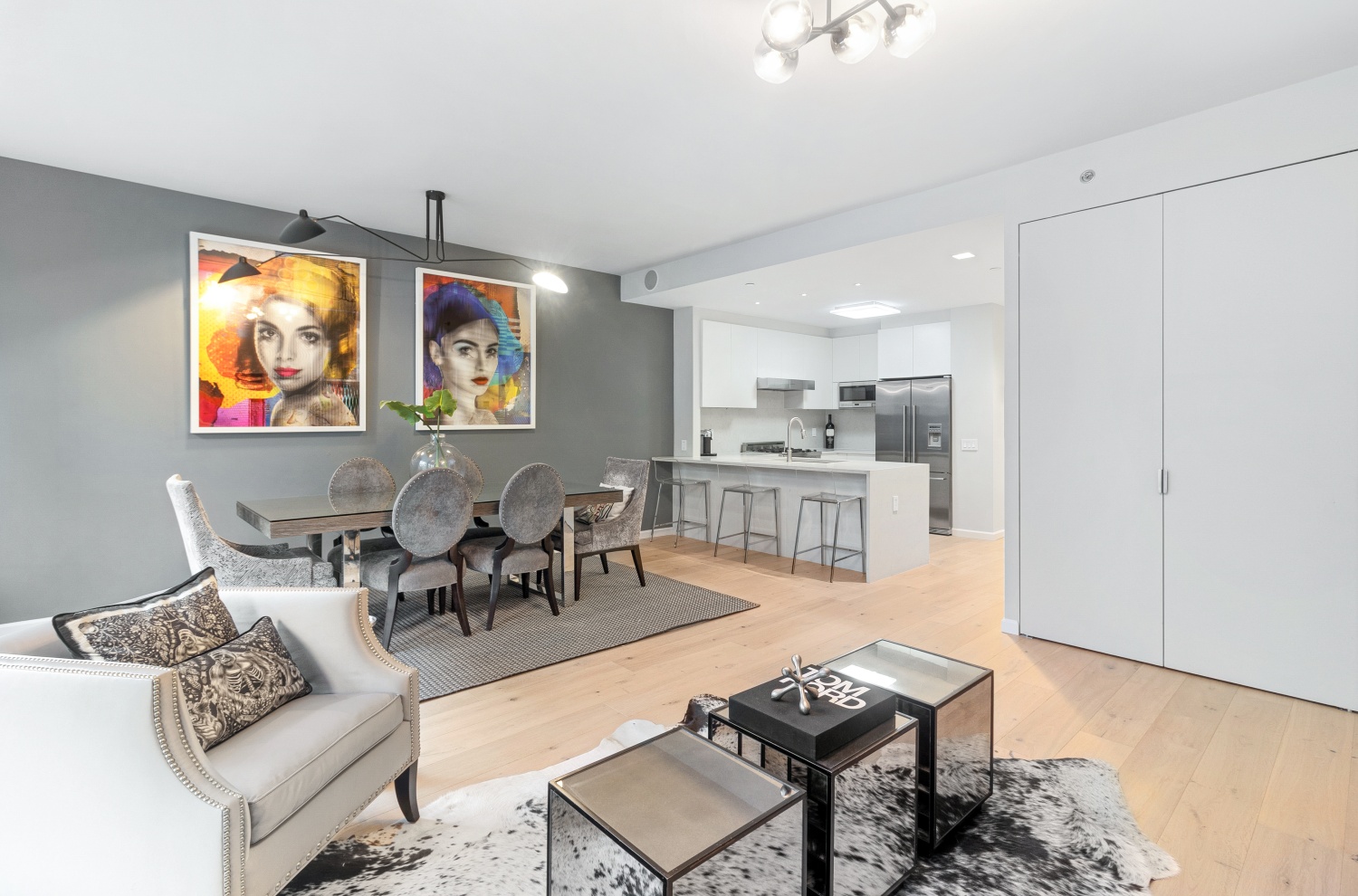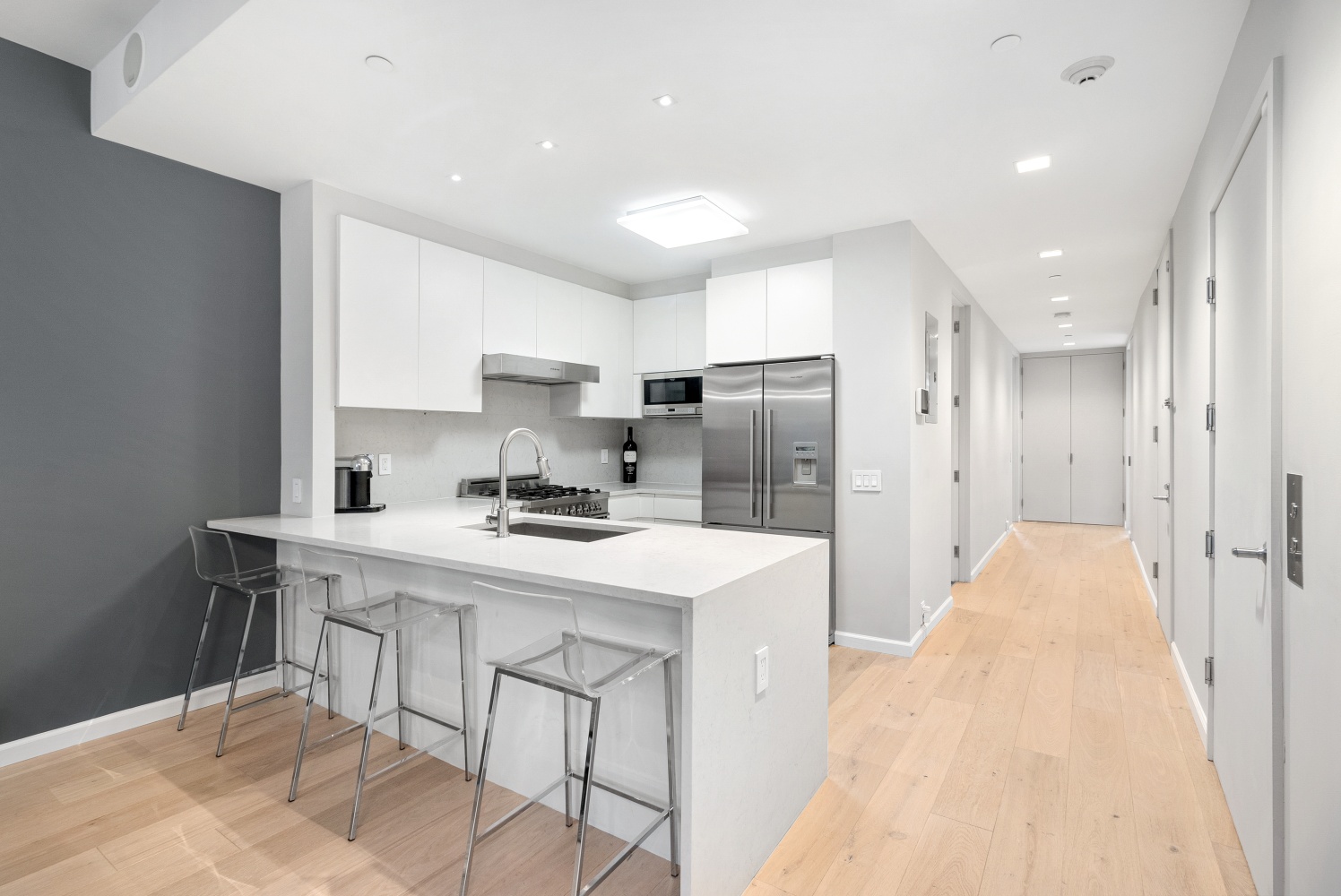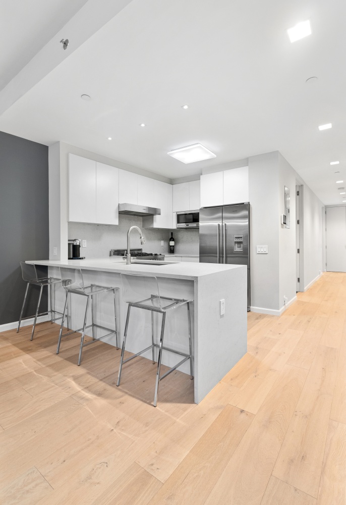 The open kitchen is outfitted with sleek cabinetry, waterfall countertops, a double-drawer dishwasher, refrigerator, and a vented range. An oversized counter and breakfast bar provide added versatility.