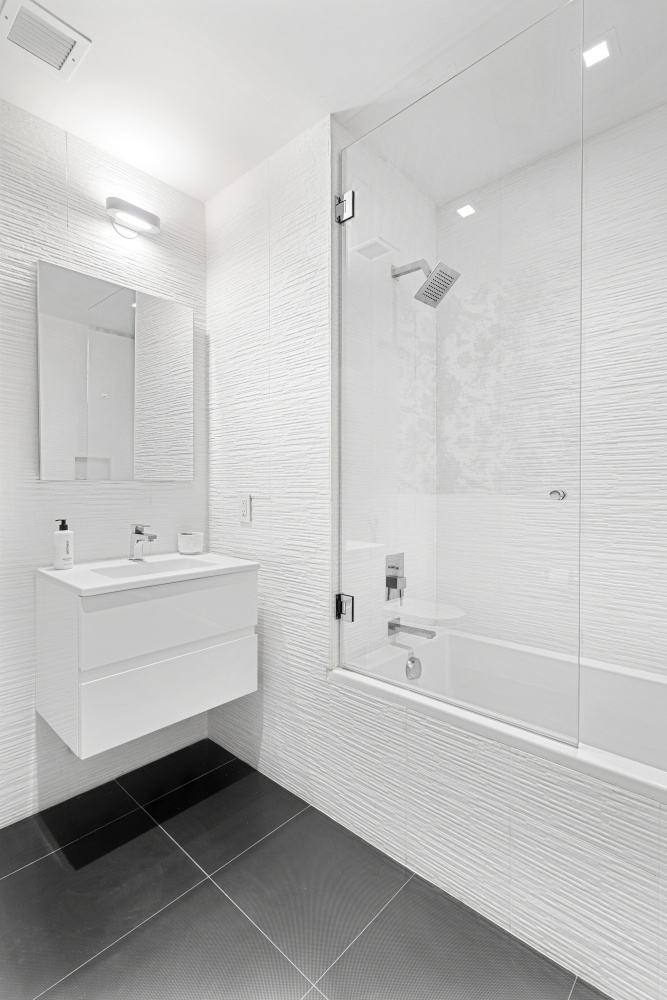 The hall bathroom is finished with contemporary tile and a glass-enclosed shower. Both bedrooms are well-proportioned with generous storage. The en-suite bathroom features a double vanity and modern fixtures.