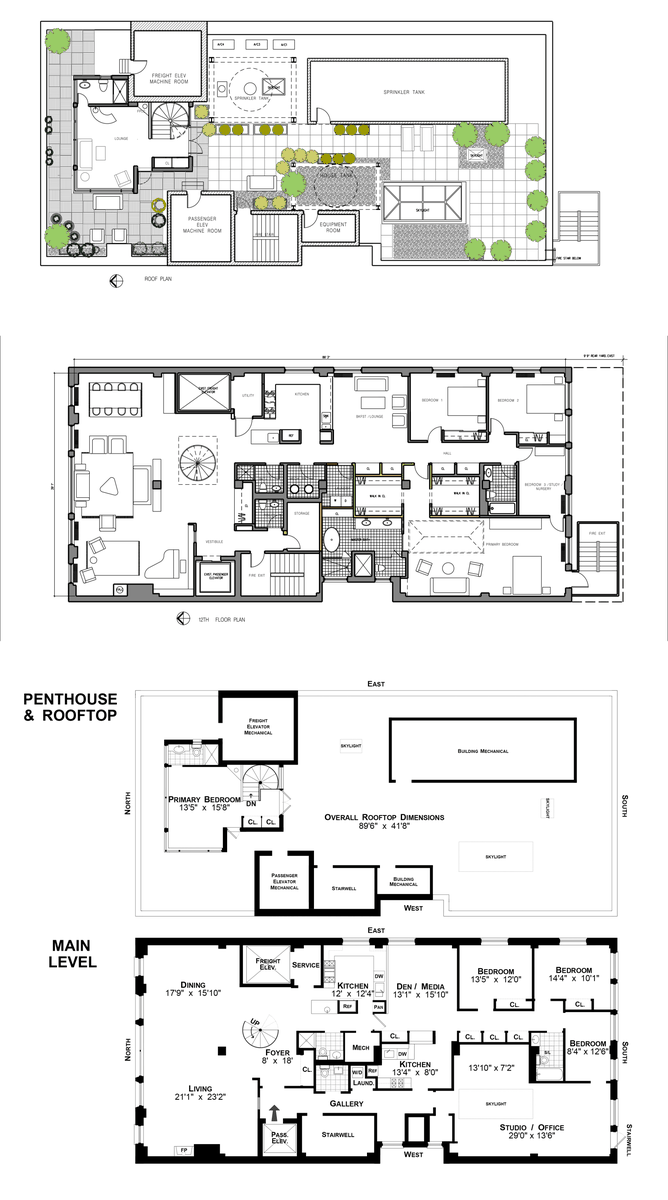 Enter the residence to find an expansive 40-foot wide Living/Dining room with 11-foot beamed-ceilings, a working fireplace and iconic views of the Chrysler Building and the city beyond from a wall of double glazed picture windows. Nearby, you'll find the large windowed chef's kitchen and adjacent lounge. Just beyond, a hallway leads to 3 bright bedrooms and 2 full bathrooms. Off the living room, a wide curved staircase leads up to the sun-blasted penthouse level currently used as a primary bedroom suite with access to a large, fully irrigated private roof terrace with multiple seating areas and sweeping city views. Separated from the residence is a large working studio with its own kitchen and bathroom. This wonderful space is completely independent, or can be joined with the main residence to create a magnificent six bedroom home. The options are endless! Additional amenities include multi-zoned central air-conditioning, a vented washer-dryer, tons of storage and custom lighting on dimmers throughout.