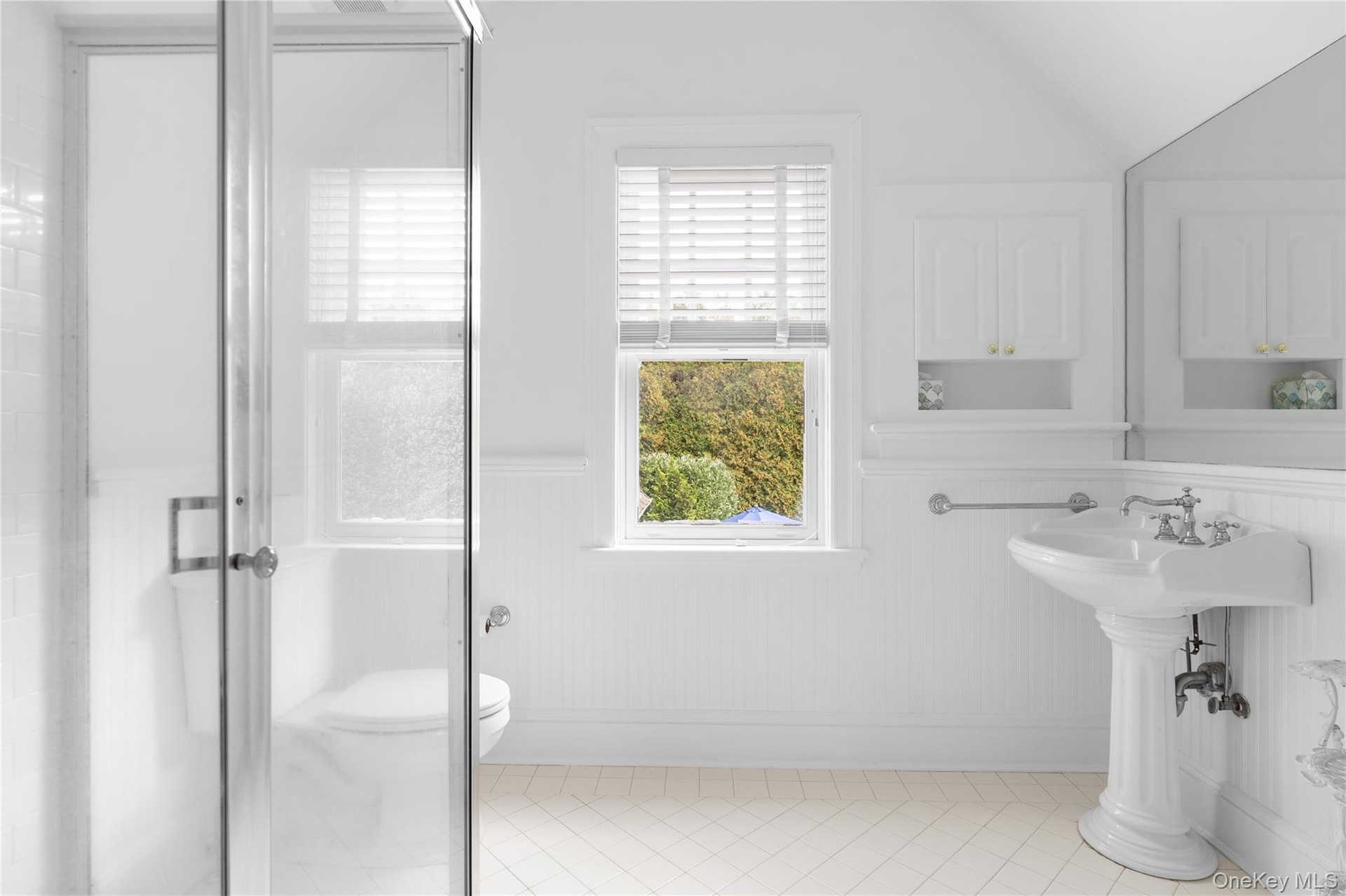 - Bathroom with a shower stall, a wainscoted wall, a sink, and toilet