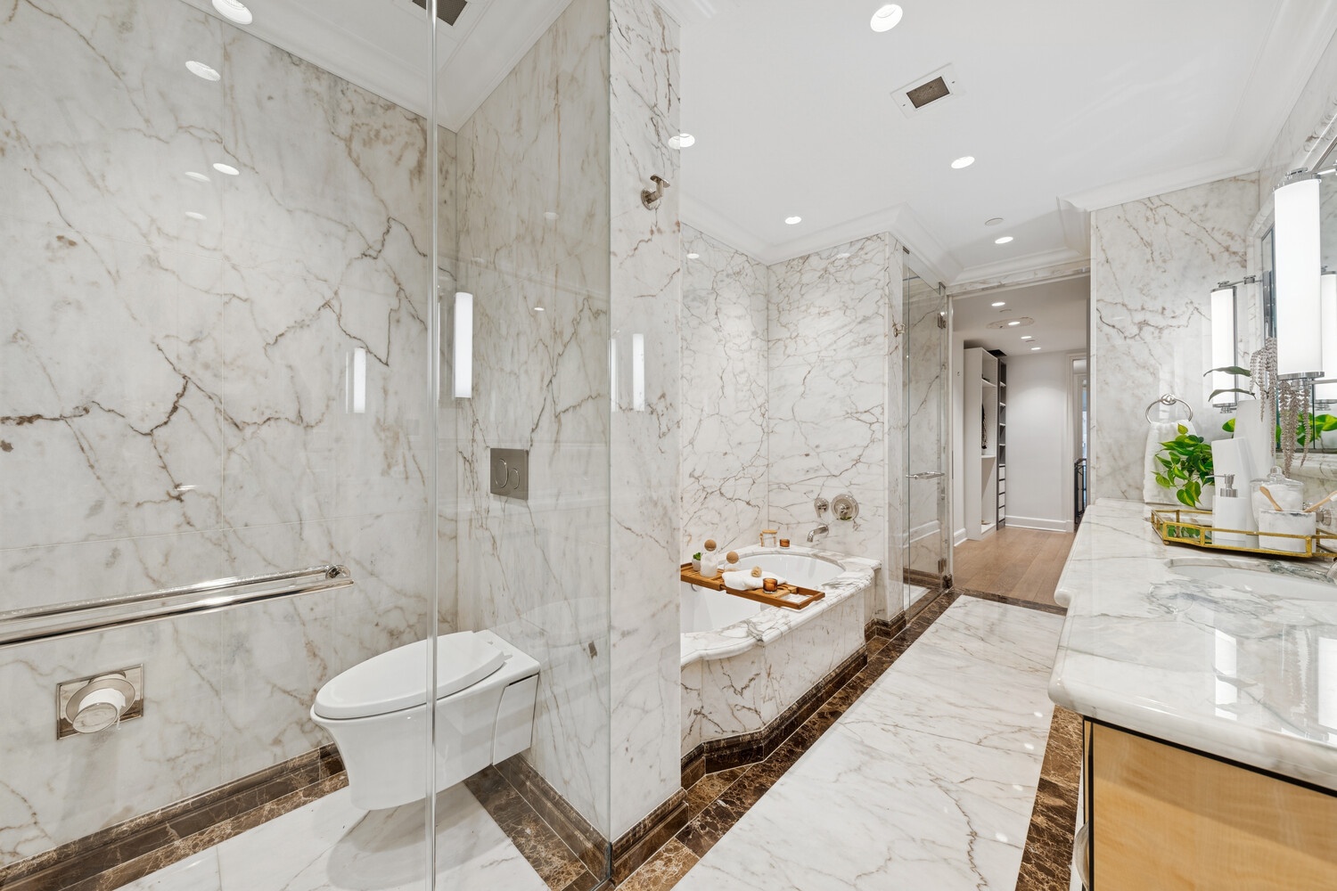 Thoughtfully designed with white oak parquet floors, custom millwork, and soaring ceilings, the residence blends classic sophistication with modern luxury. The European-style kitchen is a chef's dream, outfitted with bespoke oak cabinetry, La Cornue range, marble surfaces, and appliances by Miele and Sub-Zero. Lavish baths feature marble finishes, parchment lacquer vanities, and polished nickel fixtures.