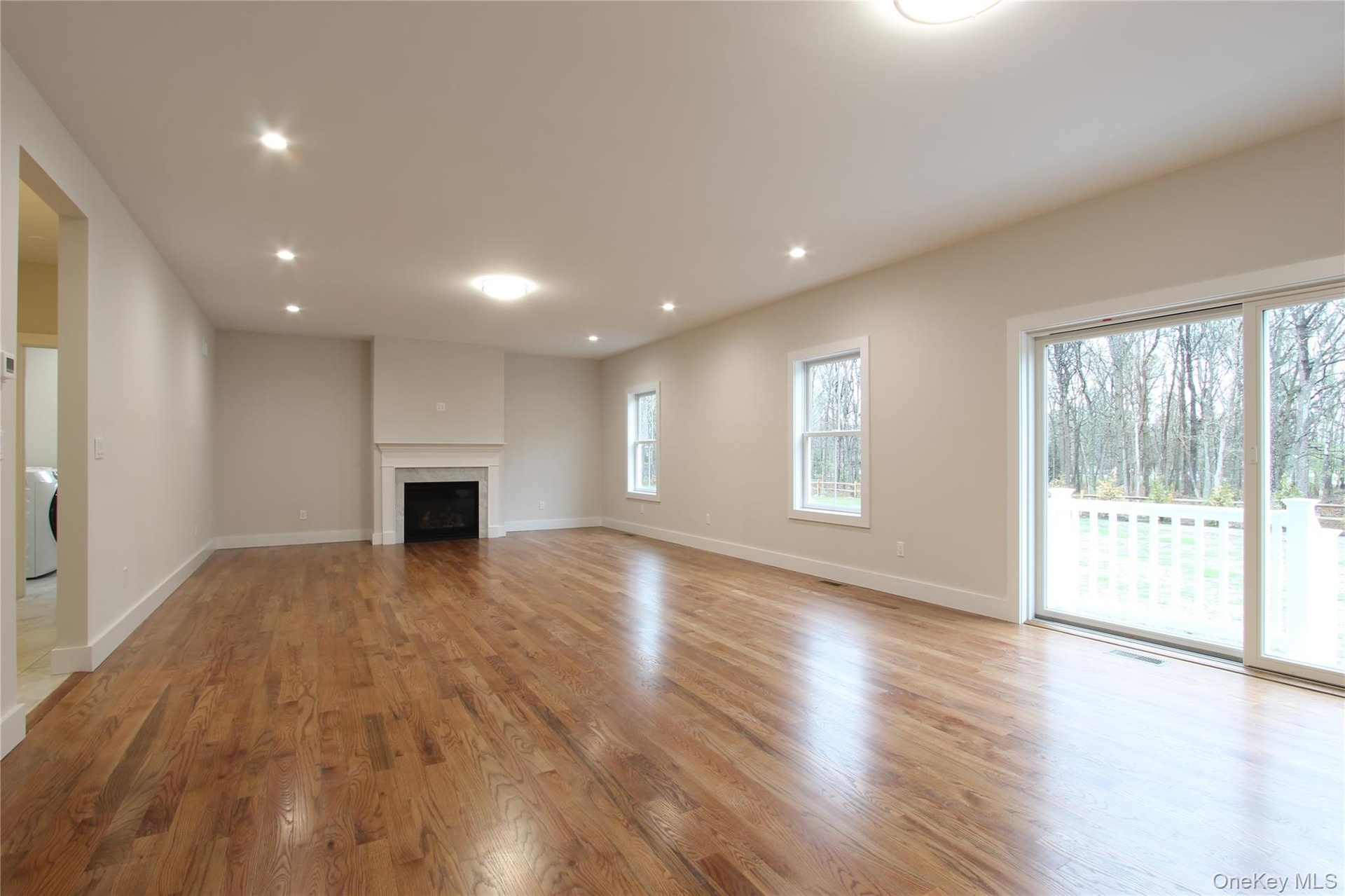 - Unfurnished living room featuring light wood finished floors, recessed lighting, a fireplace, and washer / clothes dryer