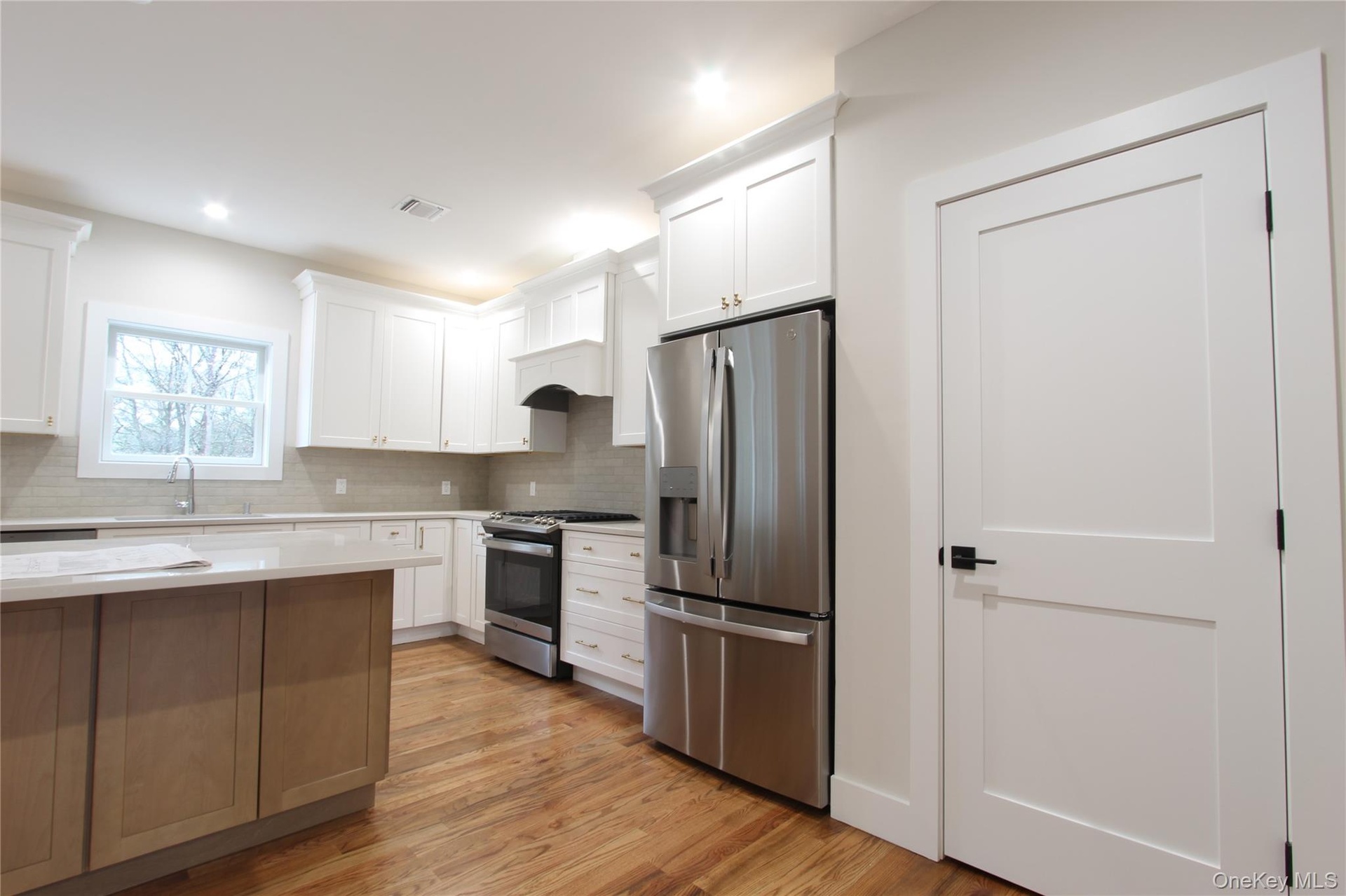 - Kitchen featuring stainless steel appliances, light wood finished floors, backsplash, light countertops, and white cabinetry