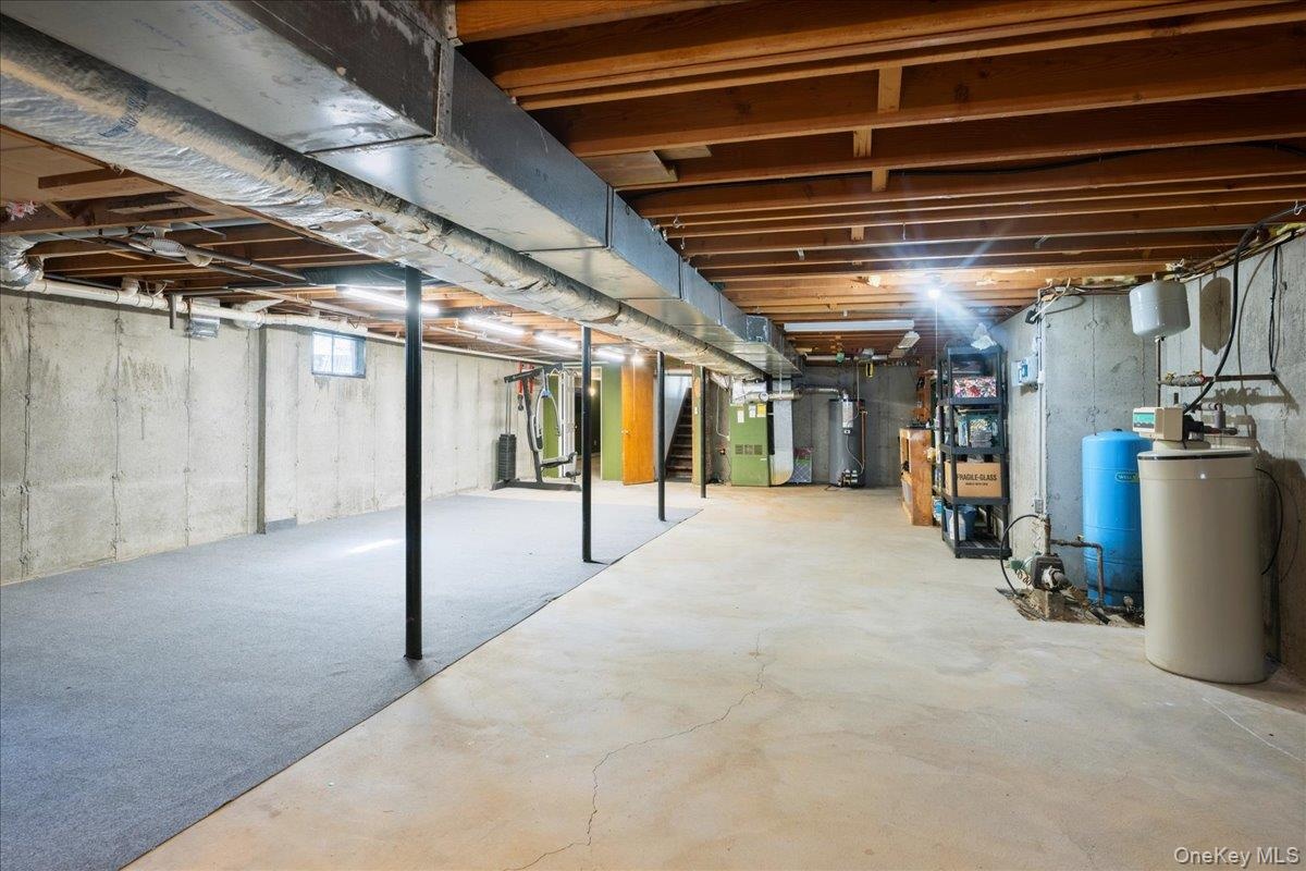 - Unfinished basement featuring stairway, heating unit, and electric water heater