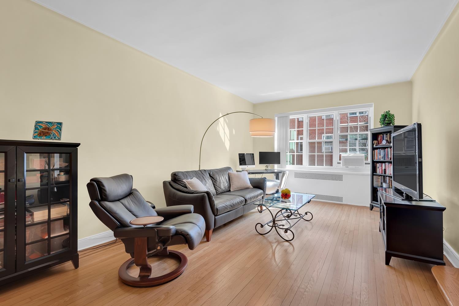 This charming apartment is located in one of Jackson Heights" historic garden co-ops and overlooks a beautifully landscaped interior garden-complete with tables, chairs, and benches for relaxing during the warmer months.