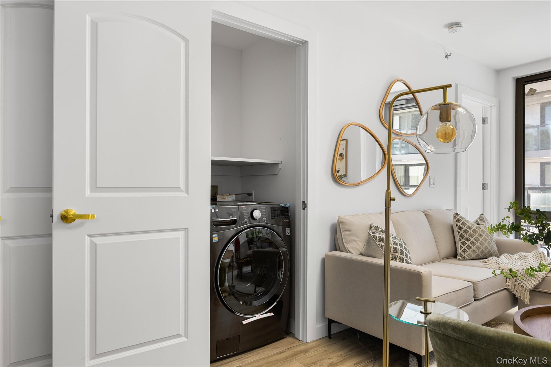 - Laundry room featuring washer / dryer, laundry area, and light wood finished floors