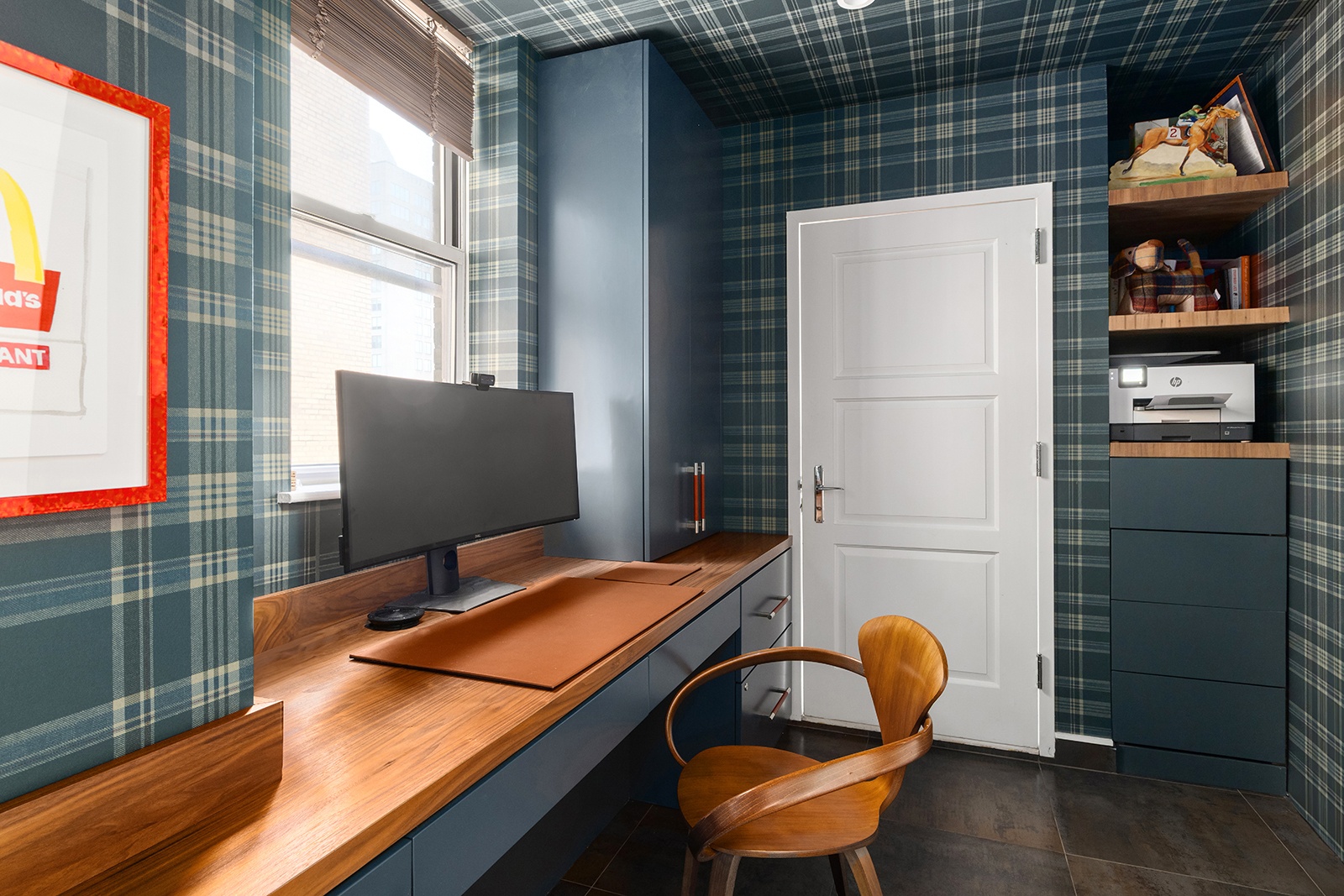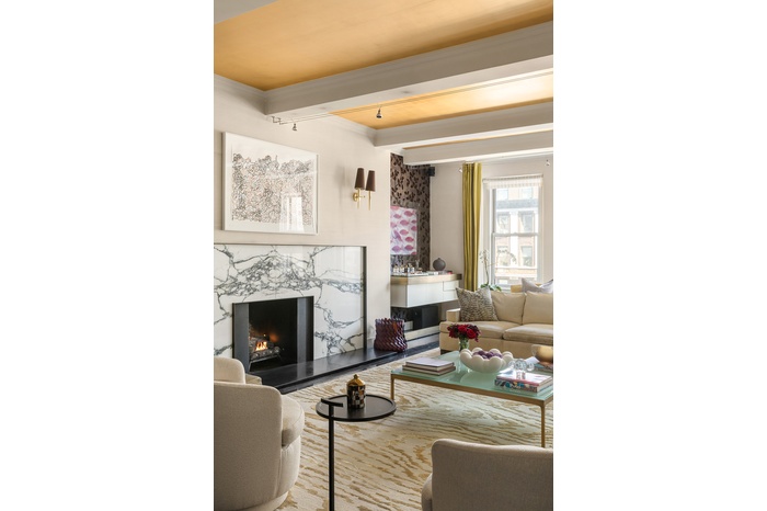 Entering the home from a private vestibule, you step into the long gallery that accesses the public spaces. Overlooking Park Avenue, the expansive living room features a beautiful, custom-designed marble mantle fireplace, coffered ceilings and huge windows affording ample natural light. The large dining room offers north and west city skyline views, with chic herringbone wood flooring underfoot. A handsome library sits between with a discreet powder room adjacent.