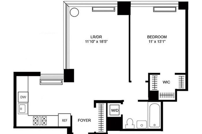The apartment features oversized floor-to-ceiling windows with solar shades, soaring ceilings throughout, and a generously sized bedroom that easily accommodates a king-size bed. The bedroom includes a large walk-in closet, while the living room offers a spacious double closet for additional storage.