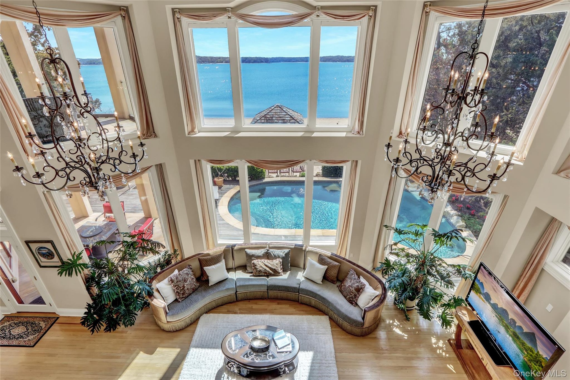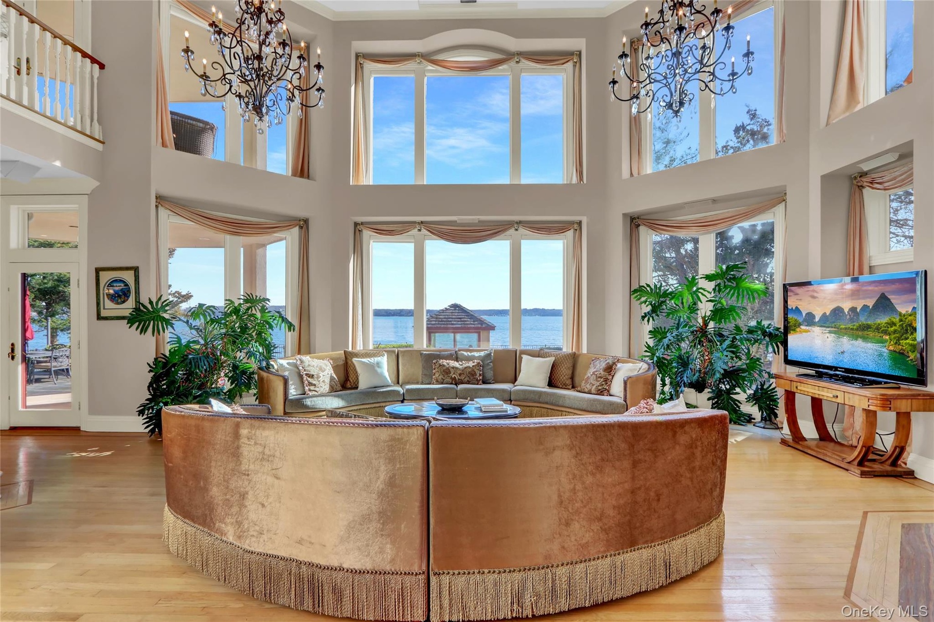 - Living room with a high ceiling, wood finished floors, an inviting chandelier, and a water view