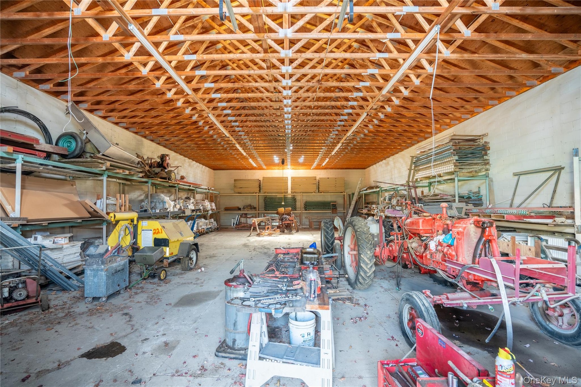 • 5,015 sq. ft. Concrete Block Storage Building: Impressively designed with 25-foot cathedral ceilings, metal shelving, and a durable concrete slab floor for heavy-duty storage.