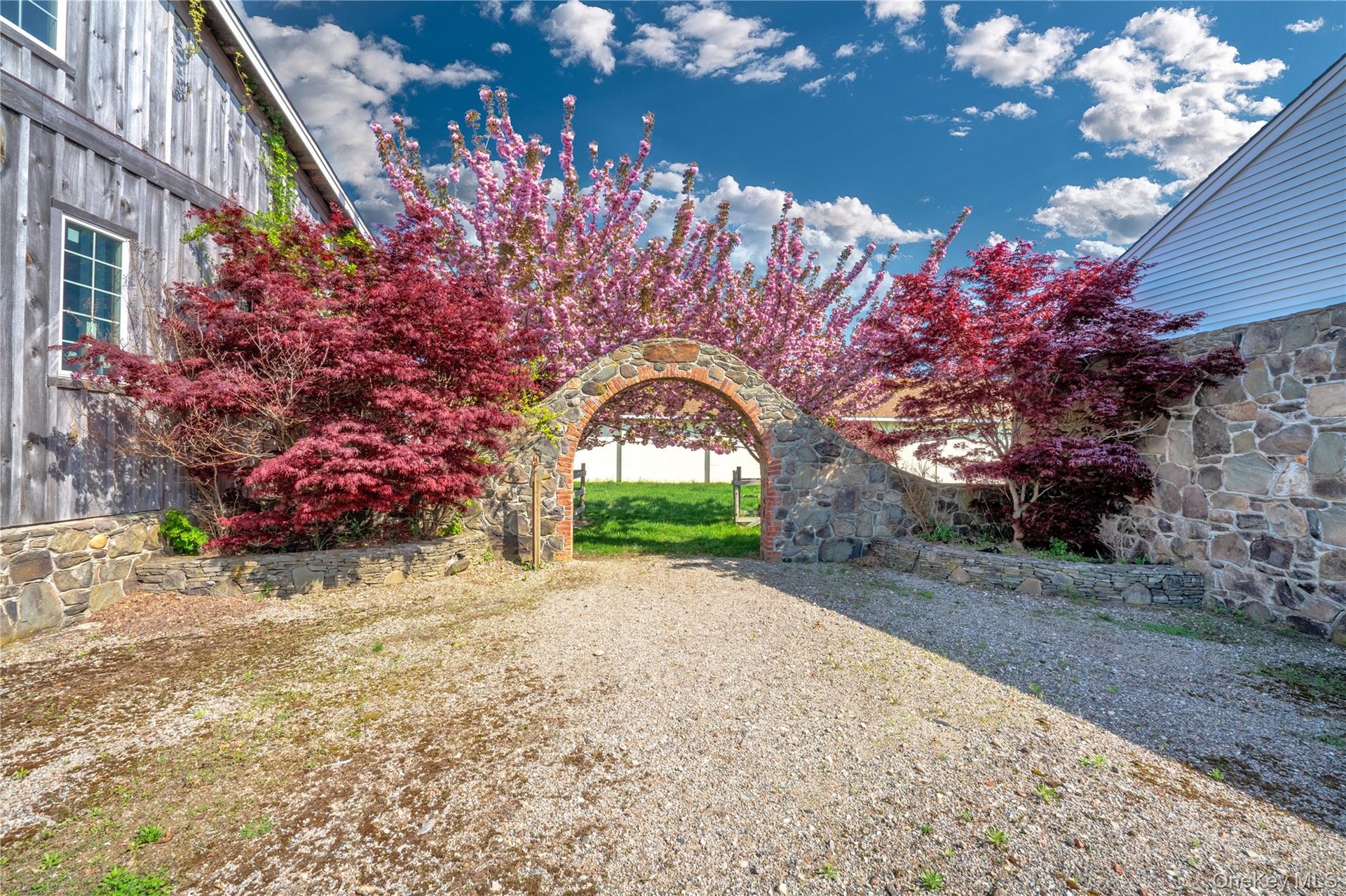 The property's entrance on the main road leads into a thoughtfully arranged 2.5-acre parcel featuring four distinctive buildings: