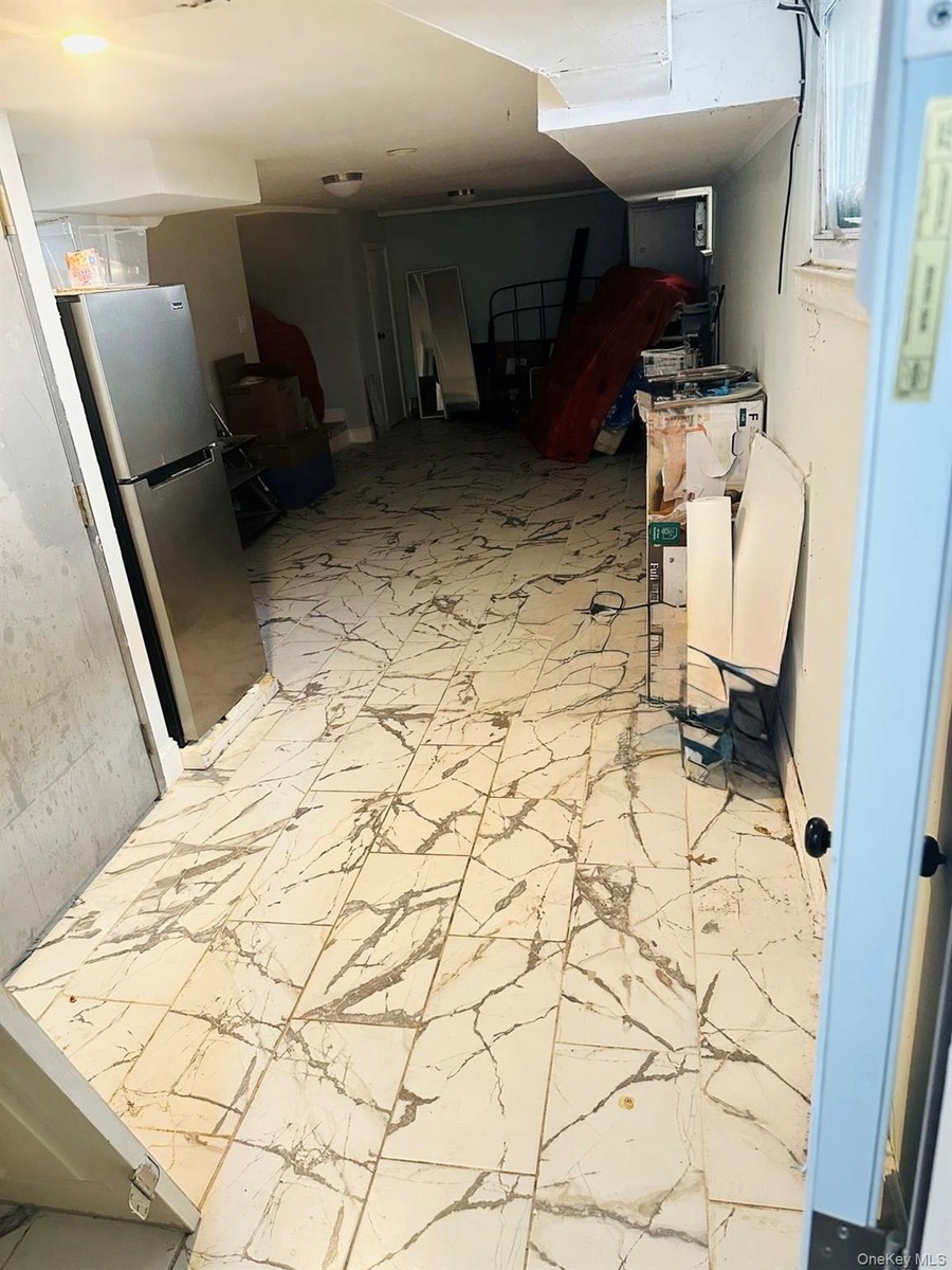 - Below grade area featuring freestanding refrigerator and marble finish floor
