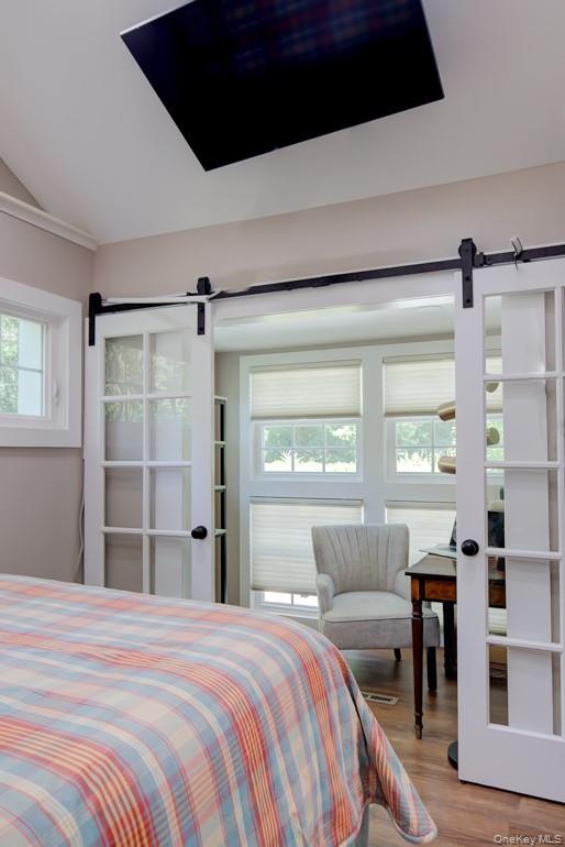 - Bedroom featuring multiple windows, a barn door, and wood finished floors