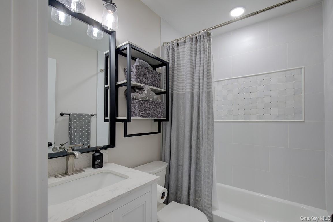 - Bathroom featuring vanity, a shower with shower curtain, and tile patterned flooring