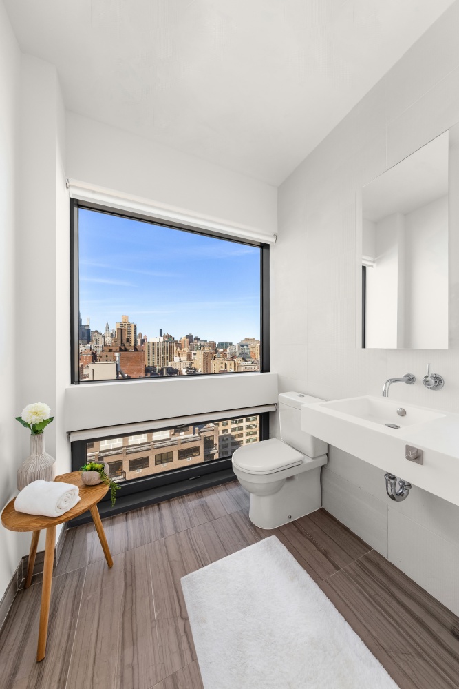 A key-locked elevator opens into a windowed entry hall which leads to a sprawling 36-foot-long great room wrapped in triple-pane floor-to-ceiling windows with three exposures. A large terrace off the living and dining area facilitates seamless alfresco dining with the Empire State and Chrysler Buildings as your backdrop.