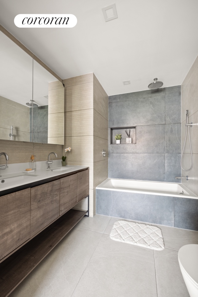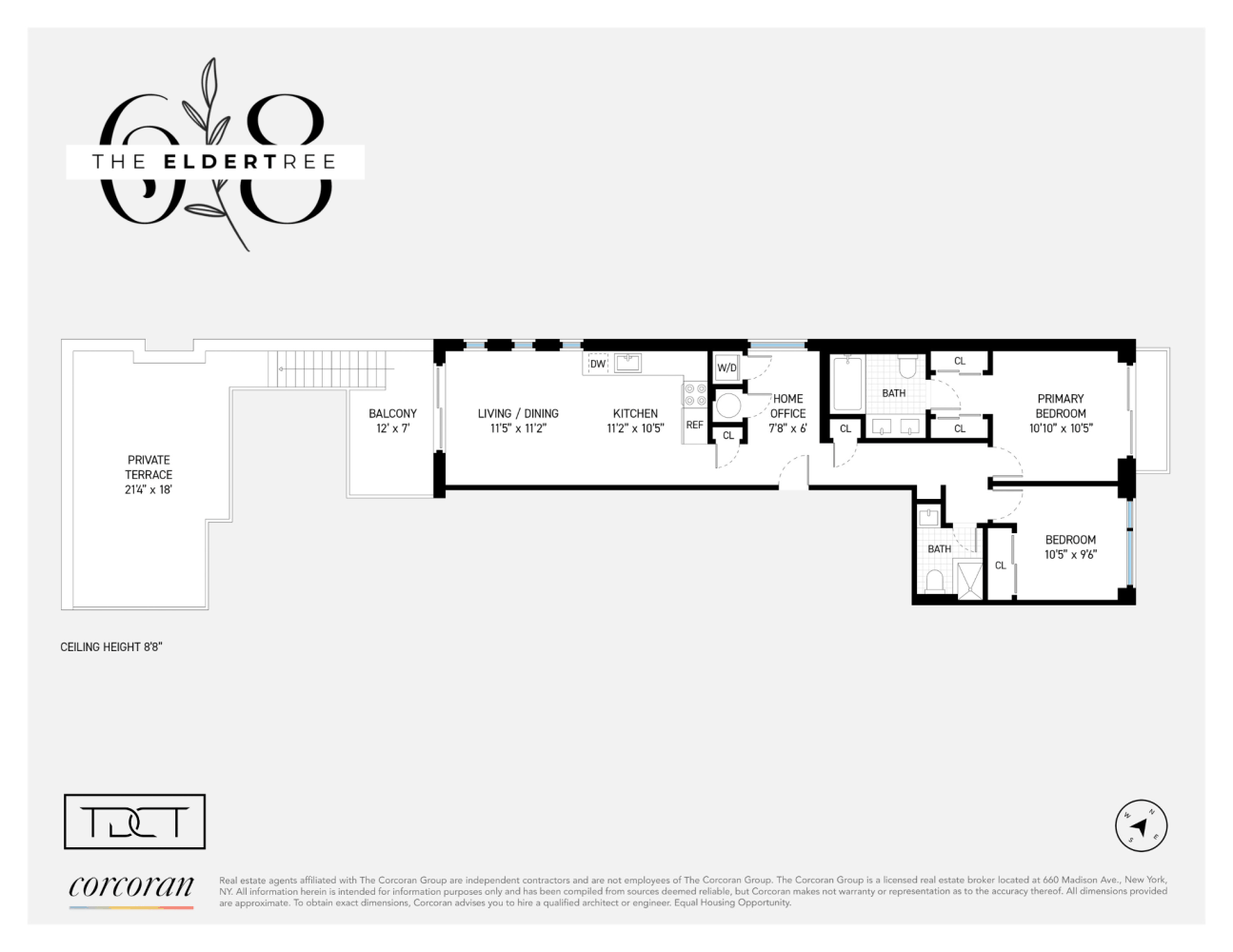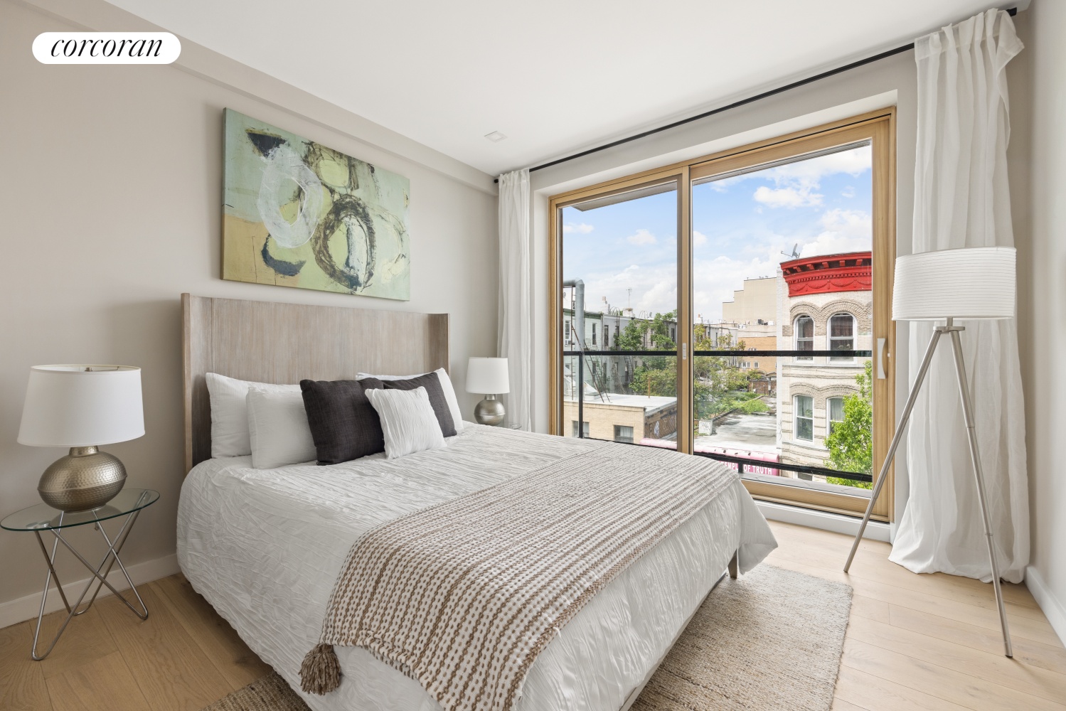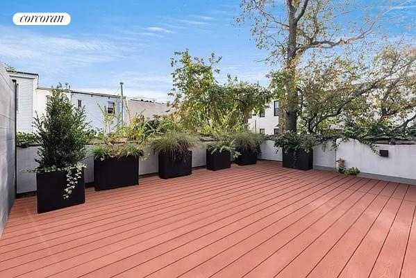 On the Northeast wing of the home, two spacious bedrooms and a balcony overlook Eldert Street. The Southwest wing has a large living room with a sliding glass door to the balcony and terrace, and an eat-in kitchen. The home office space is located in the center of the home, so you can focus without distraction.