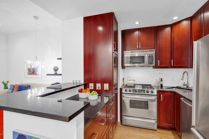 Sitting on the pen-ultimate floor of a full-service cooperative, apartment #11G features 9.5 ceilings, over-sized windows and a lovely western exposure. The kitchen has been re-imagined from the original floor plan, repositioning the refrigerator, which has allowed for additional storage by way of cabinets and a pull-out pantry.