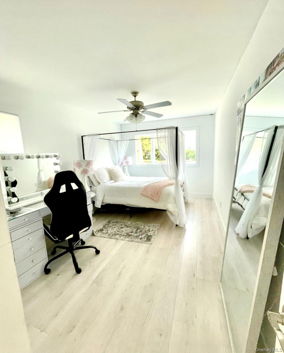 - Bedroom with a ceiling fan and wood finished floors