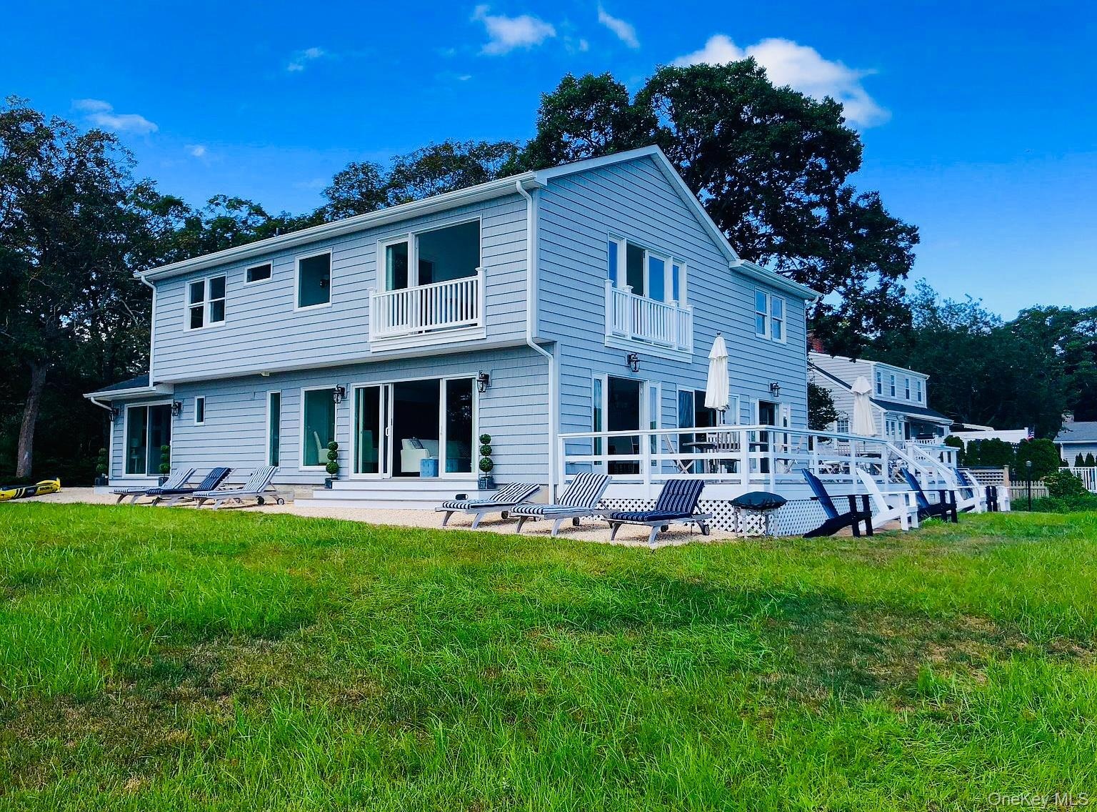 The interiors exude a sophisticated beach inspired ambiance, with light-filled spaces adorned in hues reflecting the surrounding waters. The open concept design seamlessly connects the gourmet kitchen, dining area, and living room, leading to an expansive deck, perfect for elegant entertaining or tranquil evenings watching breathtaking sunsets over Shinnecock Bay.
