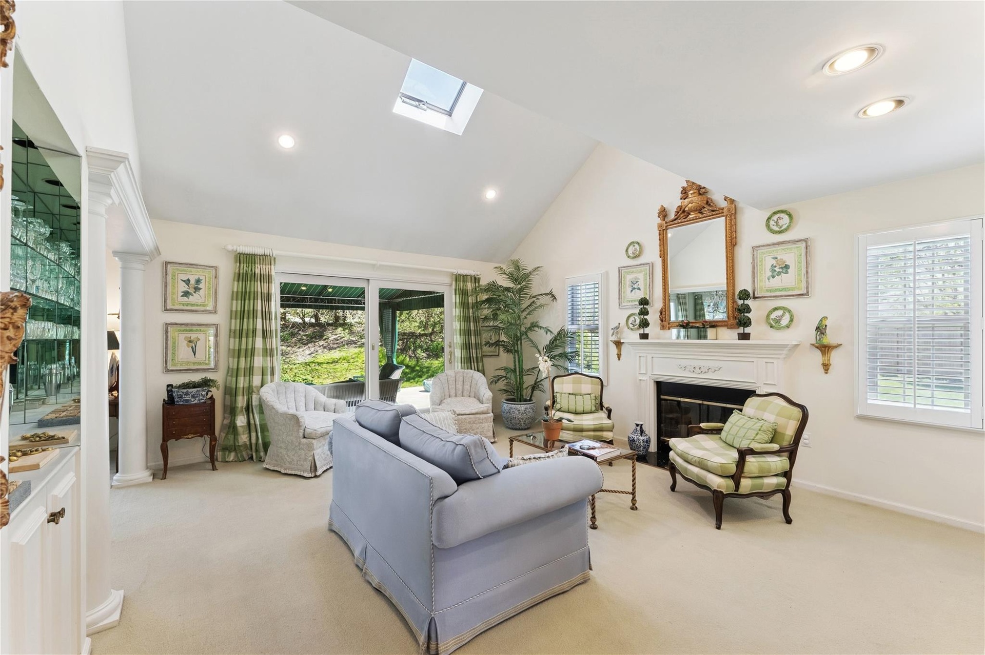 - Living room with recessed lighting, a skylight, light colored carpet, and a glass covered fireplace