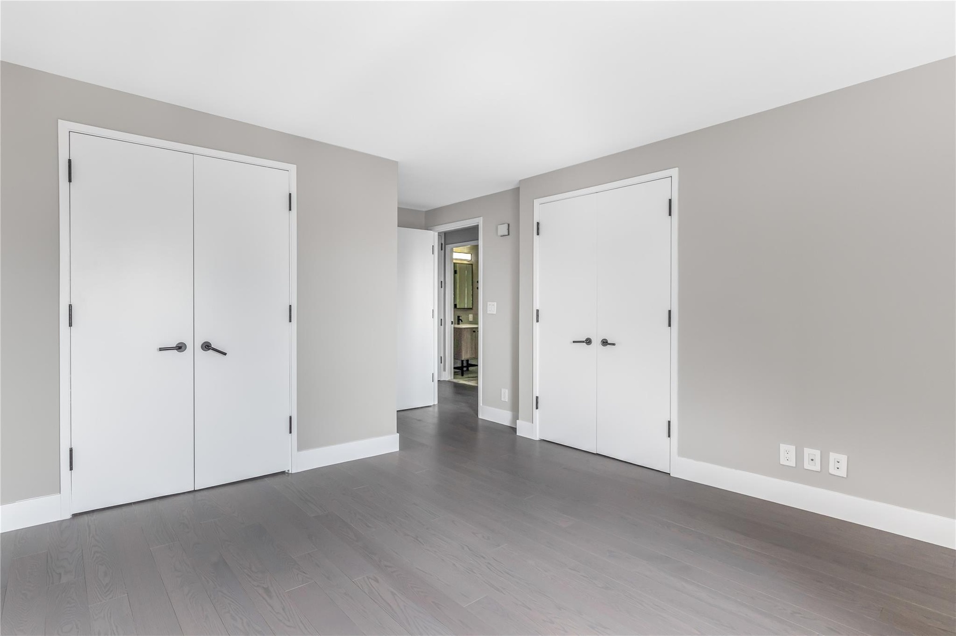- Unfurnished bedroom featuring dark wood-style flooring, baseboards, and two closets