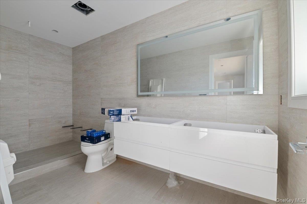 - Bathroom with vanity, tile walls, and tile patterned flooring