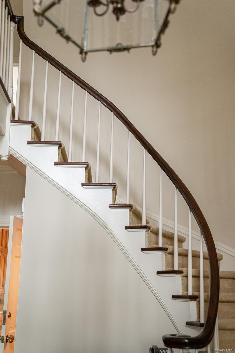 - Foyer featuring stairs, baseboards, dark wood finished floors, and ornamental molding