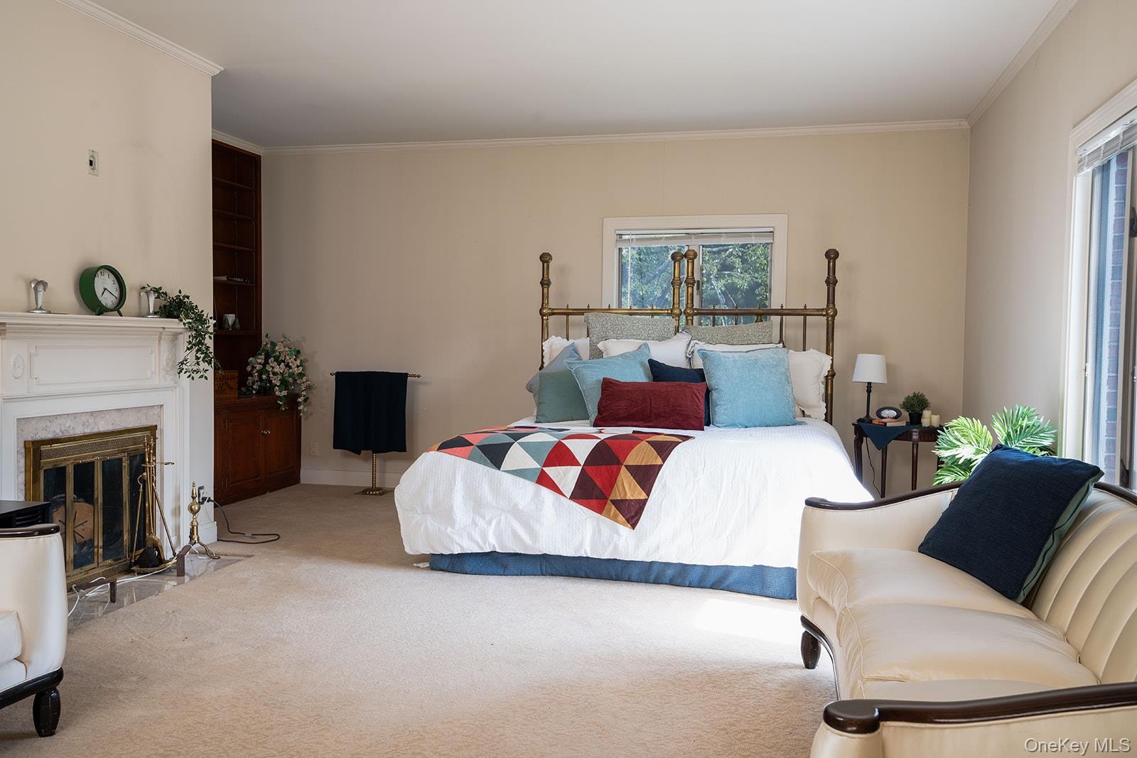 - Bedroom featuring baseboards, ornamental molding, a fireplace, and light colored carpet