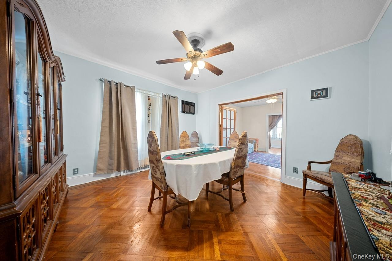 - Dining space with baseboards, a ceiling fan, and ornamental molding