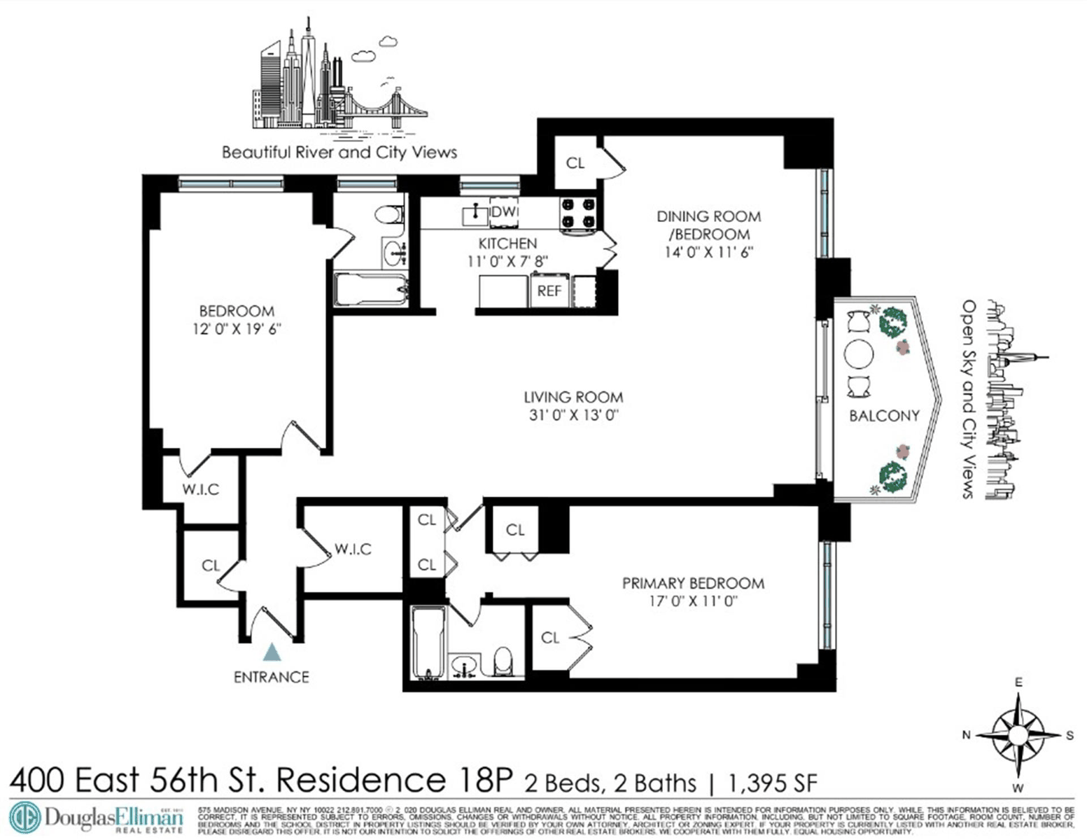 A beautiful layout, this sun-drenched 2BR/2BA home features an inviting living room with stunning herringbone floors with access to a TERRACE, kitchen with ample cabinetry and countertops, two tranquil bedrooms and stunning East River and Manhattan skyline views! This special unit offers flexibility to convert to 3 bedrooms. Enjoy a windowed kitchen, hardwood floors, and abundant storage with four walk-in closets.
