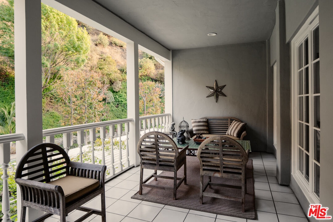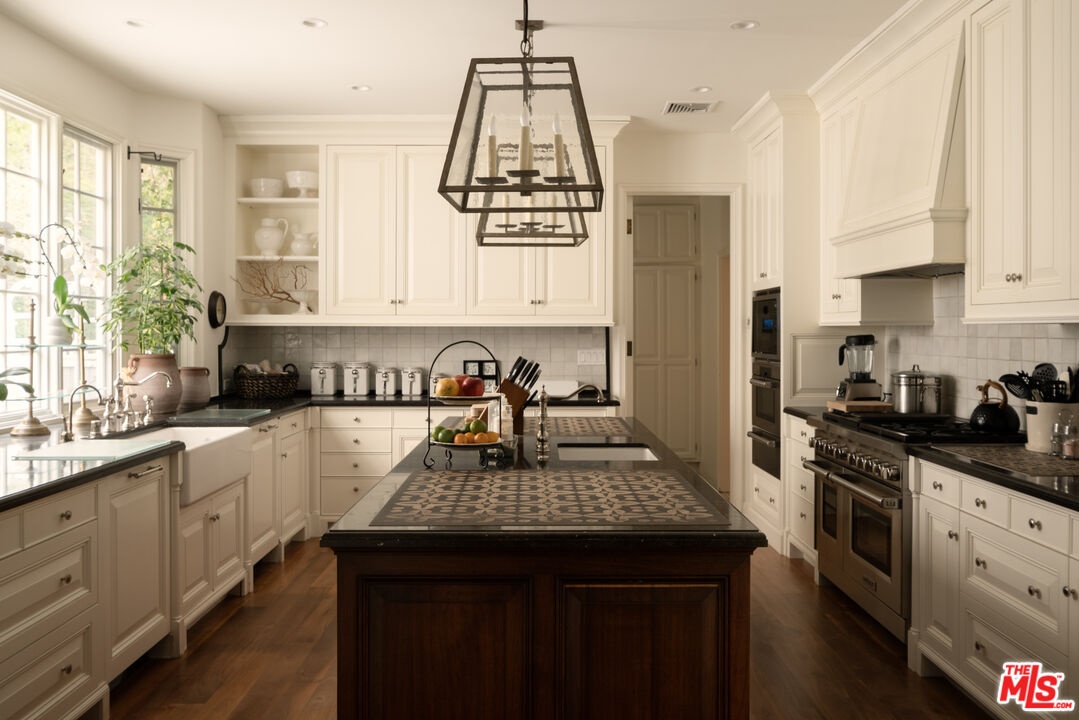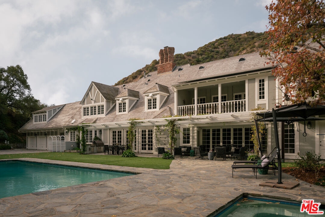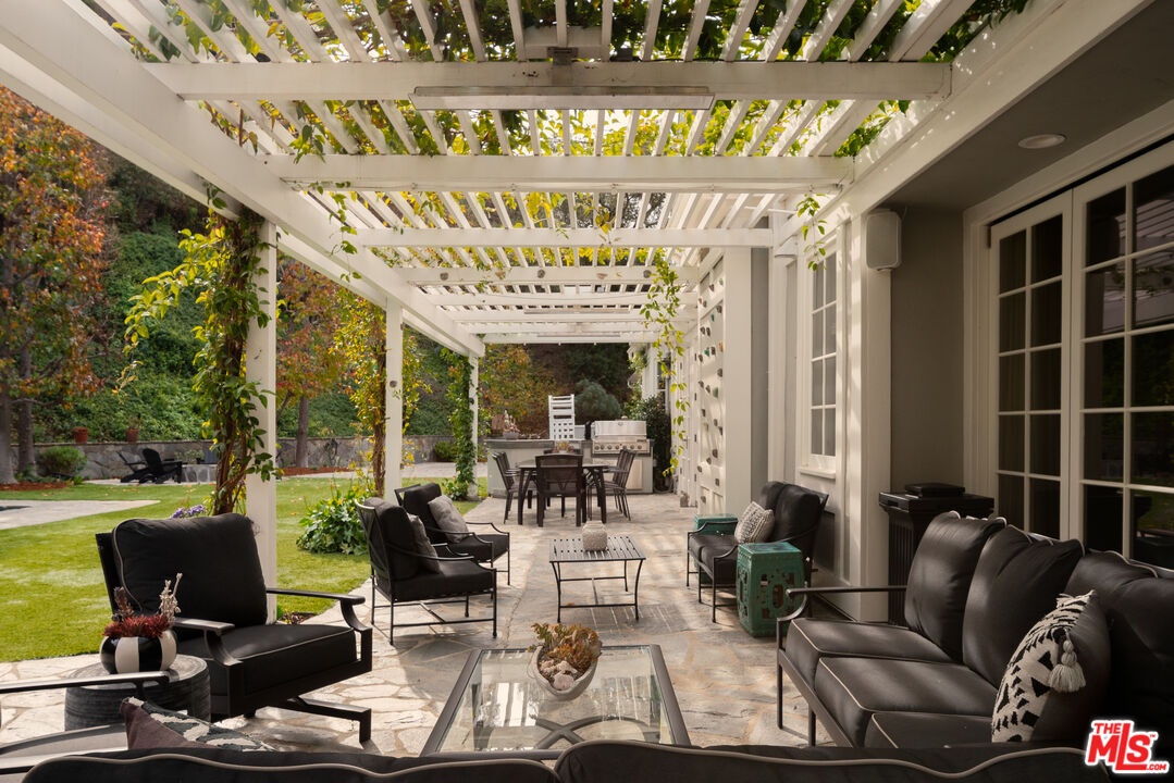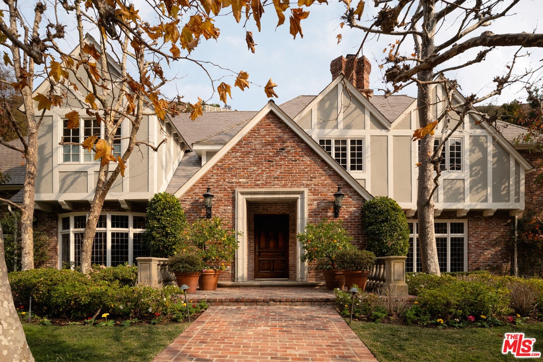 Behind the gates of Moraga Estates, one of Bel Air's most exclusive private communities, 1420 Moraga Drive sits on over six acres of land surrounded by hillside views and absolute privacy. This stately Tudor residence is discreetly sited with approximately 600 feet of street frontage, its brick facade softened by curated landscaping and a canopy of mature sycamores. Original parquet in the foyer with added custom walnut floors throughout and thick doors with hand-forged hardware anchor the interiors in material richness. The formal dining room is wrapped in hand-painted wallpaper, designed around custom sconces and a one-of-a-kind chandelier of olive branches adorned with topaz and crystals. The chef's kitchen features Wolf appliances, a farmhouse sink, a large island, and an adjacent pantry includes a second refrigerator, a wine refrigerator, and large-capacity freezer. The kitchen dining area has a concealed pop-up television and access through three French doors that open to a trellised patio with Barbeque area. Nearby, a built-in bar with additional beverage, wine and ice machine. A separate wood-paneled library offers a quiet retreat with a large fireplace, custom built-ins, and an ensuite bath, making it ideal as an office or guest suite. One of the home's most artful vignettes, the powder room is wrapped in ethereal, painterly wallpaper and grounded by striking black marble flooring. An oval window with a radial grille casts soft, diffused light across the space, illuminating a hand-carved antique vanity and custom marble sink. The primary suite opens to a private terrace with sweeping hillside views often visited by deer. The bathroom evokes the feeling of a treehouse spa with large windows, dual vanities with filtered water, dual toilet closets with Toto Washlets, a seven-foot soaking tub, and a multi-head rain shower. Chevron-patterned walnut and marble floor and ambient lighting add a sense of calm and continuity. Double dressing rooms include custom cabinetry and built-in safes. The guest wing includes three generously sized bedrooms with ensuite baths and walk-in closets. Along the hallway there's additional storage with three walk-in closets and two linen cabinets. Further down the hallway is a family lounge and a large bonus room that currently serves as a music studio. An additional guest bedroom, walk-in closet and bath is down the backstairs. Outside, a vine-draped pergola runs the full length of the home, strung with twinkle lights and warmed by built-in heaters. The grounds feature a large pool and spa, Swedish sauna, herb garden, firepit with lounge seating, a separate pool bathroom with shower, climbing wall, gymnastics rings, yoga sling, and Rogue stall bars. A fully equipped outdoor kitchen and dining area enhance the experience. The stone driveway leads to a gated portico and an expansive motor court with access to the climate-controlled three-car garage. Security is paramount on Moraga Drive. The community security features 24-hour gated guard service, roving patrol vehicles, and a self-launching drone with infrared technology, making Moraga one of the most advanced residential surveillance systems in the country.