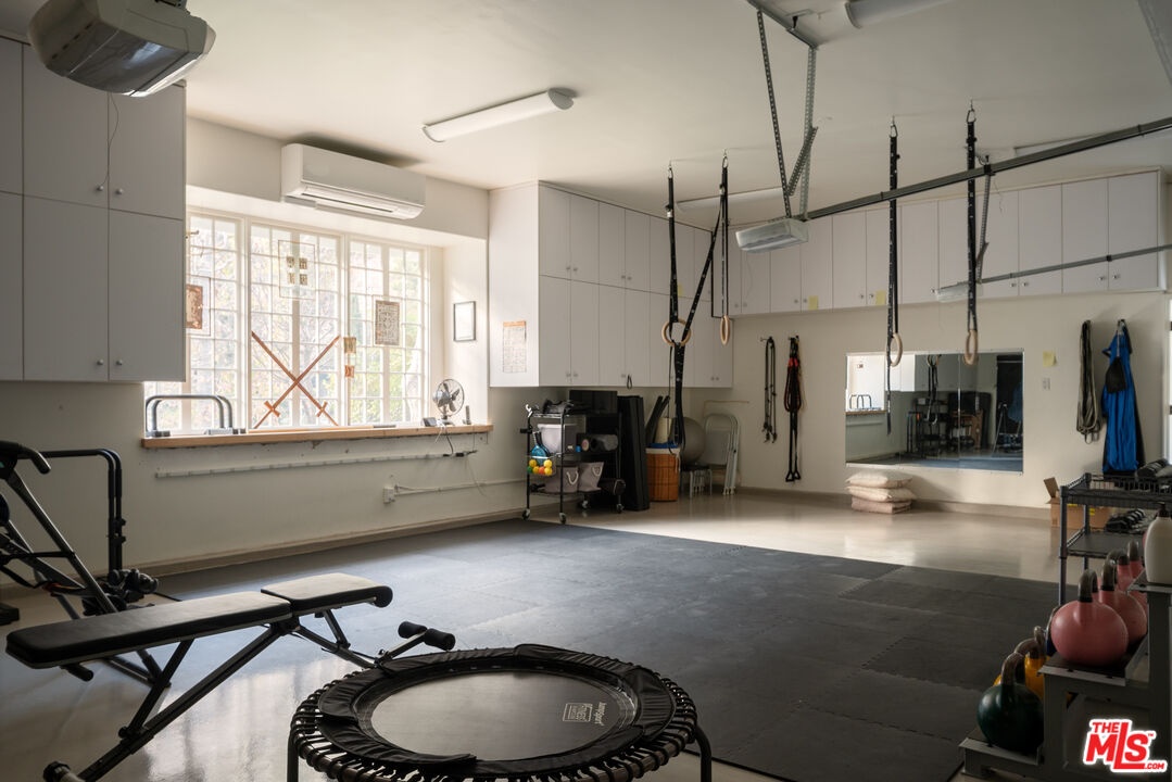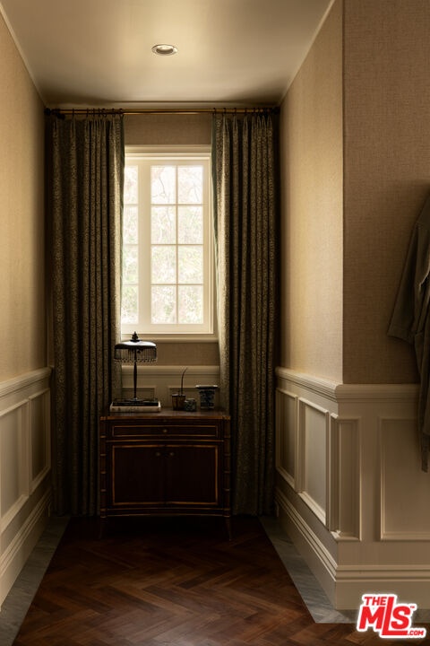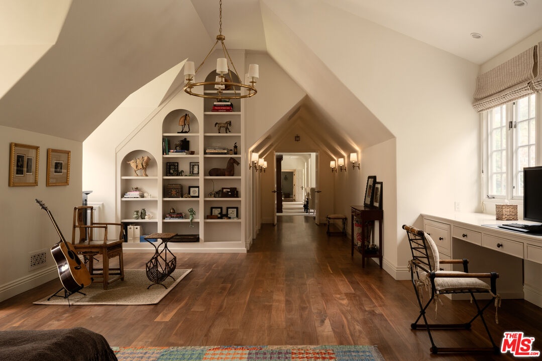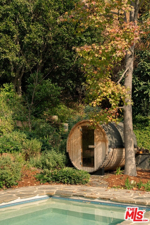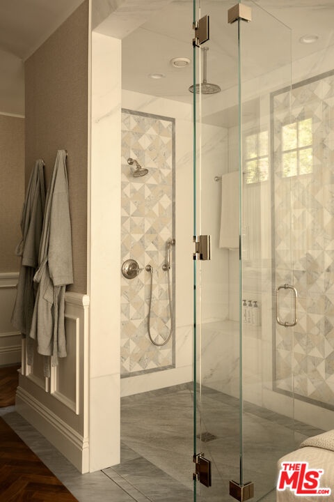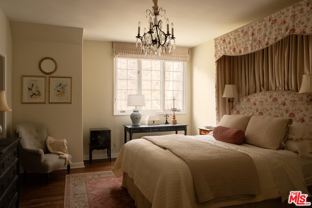 Behind the gates of Moraga Estates, one of Bel Air's most exclusive private communities, 1420 Moraga Drive sits on over six acres of land surrounded by hillside views and absolute privacy. This stately Tudor residence is discreetly sited with approximately 600 feet of street frontage, its brick facade softened by curated landscaping and a canopy of mature sycamores. Original parquet in the foyer with added custom walnut floors throughout and thick doors with hand-forged hardware anchor the interiors in material richness. The formal dining room is wrapped in hand-painted wallpaper, designed around custom sconces and a one-of-a-kind chandelier of olive branches adorned with topaz and crystals. The chef's kitchen features Wolf appliances, a farmhouse sink, a large island, and an adjacent pantry includes a second refrigerator, a wine refrigerator, and large-capacity freezer. The kitchen dining area has a concealed pop-up television and access through three French doors that open to a trellised patio with Barbeque area. Nearby, a built-in bar with additional beverage, wine and ice machine. A separate wood-paneled library offers a quiet retreat with a large fireplace, custom built-ins, and an ensuite bath, making it ideal as an office or guest suite. One of the home's most artful vignettes, the powder room is wrapped in ethereal, painterly wallpaper and grounded by striking black marble flooring. An oval window with a radial grille casts soft, diffused light across the space, illuminating a hand-carved antique vanity and custom marble sink. The primary suite opens to a private terrace with sweeping hillside views often visited by deer. The bathroom evokes the feeling of a treehouse spa with large windows, dual vanities with filtered water, dual toilet closets with Toto Washlets, a seven-foot soaking tub, and a multi-head rain shower. Chevron-patterned walnut and marble floor and ambient lighting add a sense of calm and continuity. Double dressing rooms include custom cabinetry and built-in safes. The guest wing includes three generously sized bedrooms with ensuite baths and walk-in closets. Along the hallway there's additional storage with three walk-in closets and two linen cabinets. Further down the hallway is a family lounge and a large bonus room that currently serves as a music studio. An additional guest bedroom, walk-in closet and bath is down the backstairs. Outside, a vine-draped pergola runs the full length of the home, strung with twinkle lights and warmed by built-in heaters. The grounds feature a large pool and spa, Swedish sauna, herb garden, firepit with lounge seating, a separate pool bathroom with shower, climbing wall, gymnastics rings, yoga sling, and Rogue stall bars. A fully equipped outdoor kitchen and dining area enhance the experience. The stone driveway leads to a gated portico and an expansive motor court with access to the climate-controlled three-car garage. Security is paramount on Moraga Drive. The community security features 24-hour gated guard service, roving patrol vehicles, and a self-launching drone with infrared technology, making Moraga one of the most advanced residential surveillance systems in the country.
