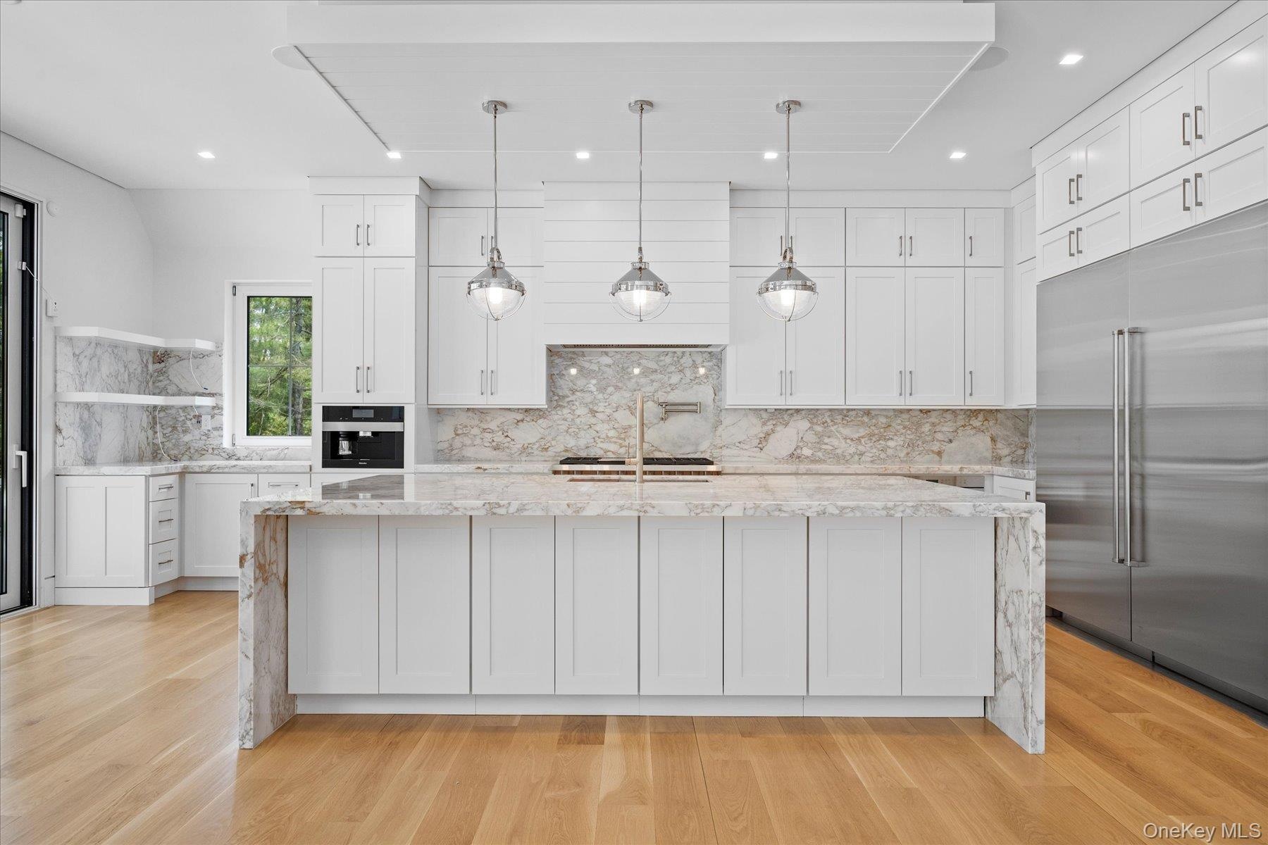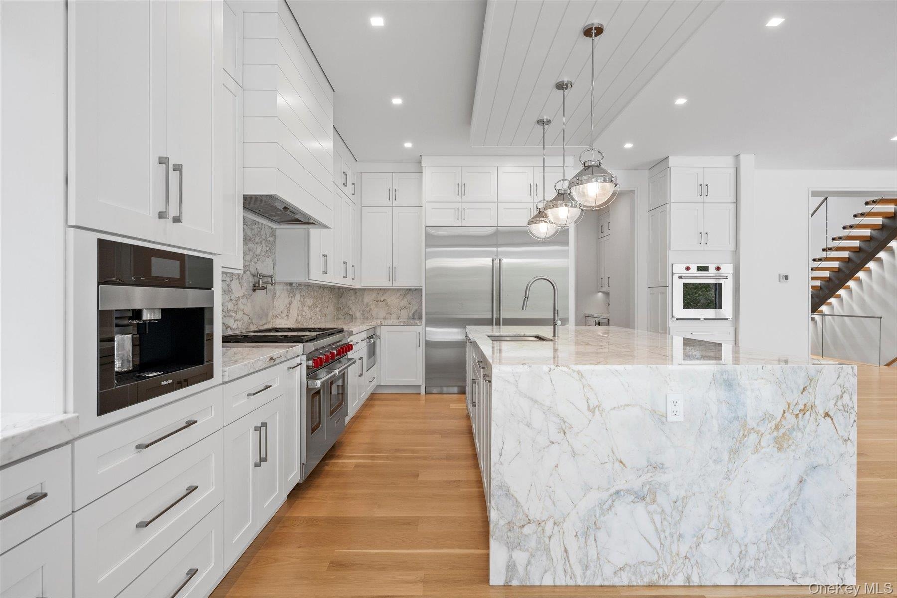 The open-concept living, dining, and kitchen areas are infused with natural light, thanks to abundance of windows and sliding doors that seamlessly integrate indoor and outdoor spaces. Notable first-floor features include a magnificent Calacatta marble fireplace in the Great Room and a chef's kitchen equipped with top-of-the-line SubZero, Wolf, and Bosch appliances. The centerpiece of this culinary space is a captivating Calacatta marble island and countertops, paired with custom white cabinetry, exemplifying the Hamptons aesthetic.