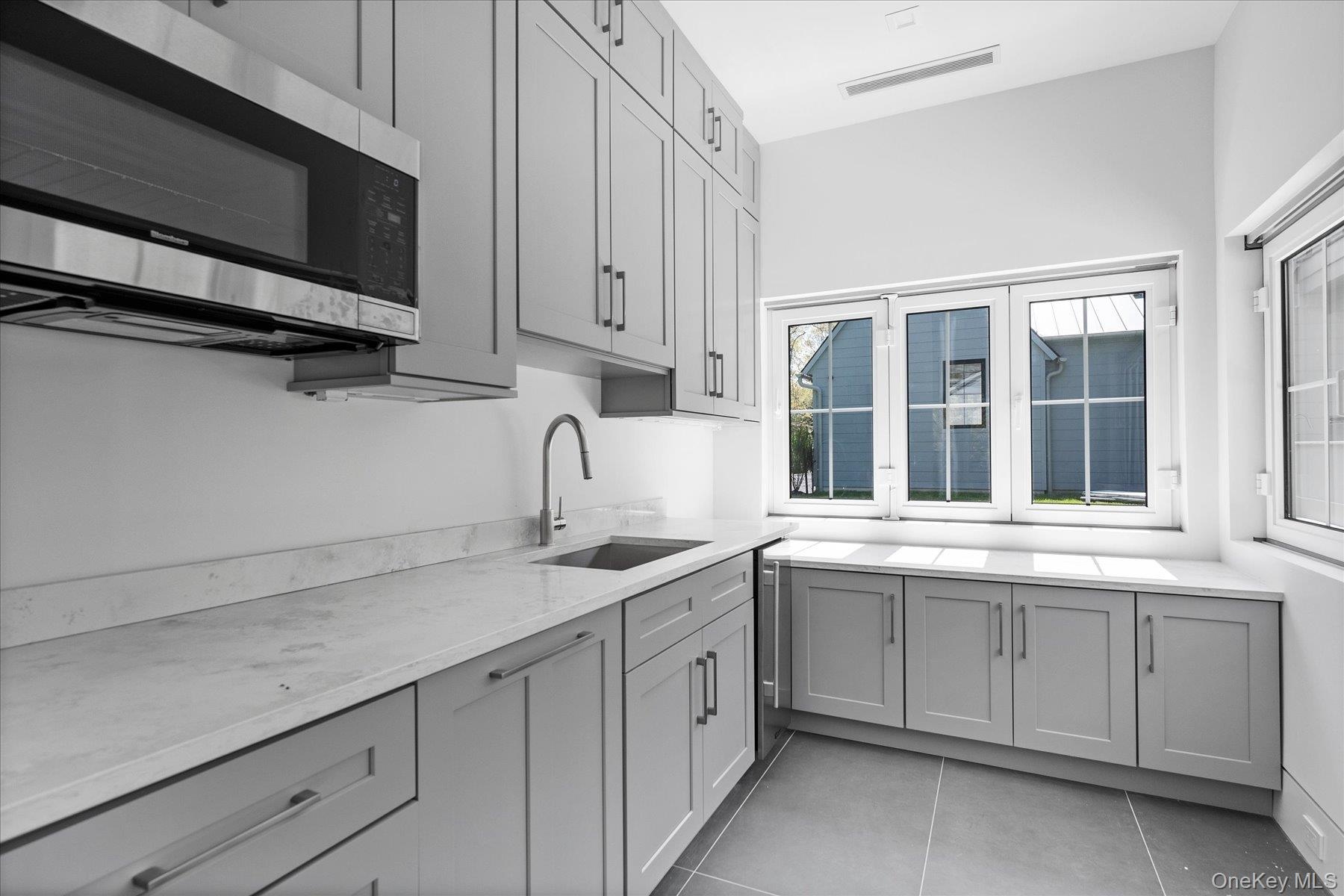 - Pool House Kitchen featuring a sink, gray cabinets, appliances with stainless steel finishes, light stone counters, and light tile patterned flooring