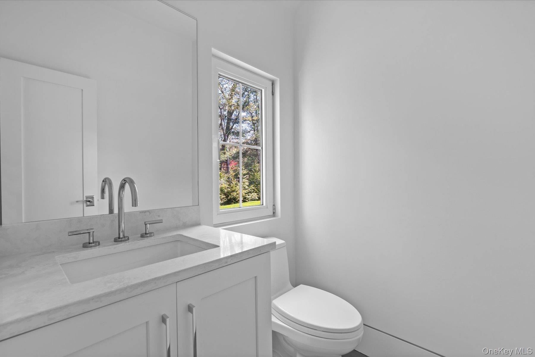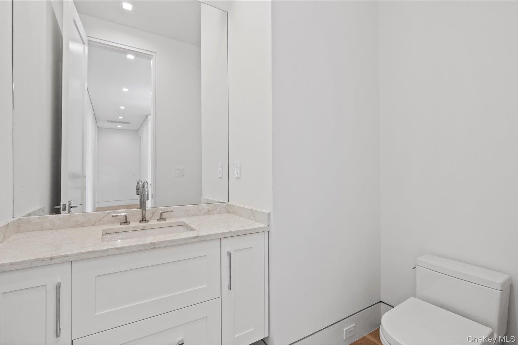 - Bathroom featuring toilet, vanity, and recessed lighting