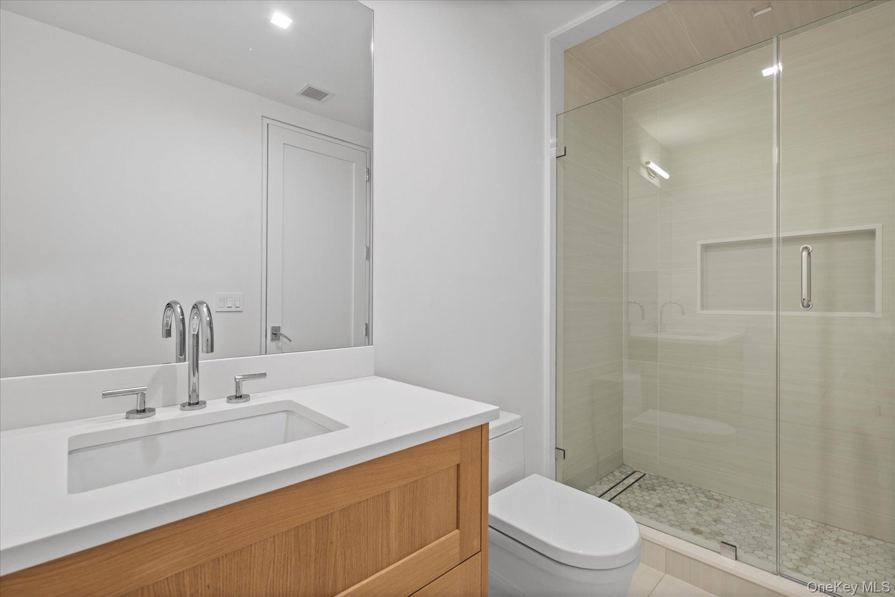 - Full bath featuring toilet, vanity, visible vents, and a shower stall