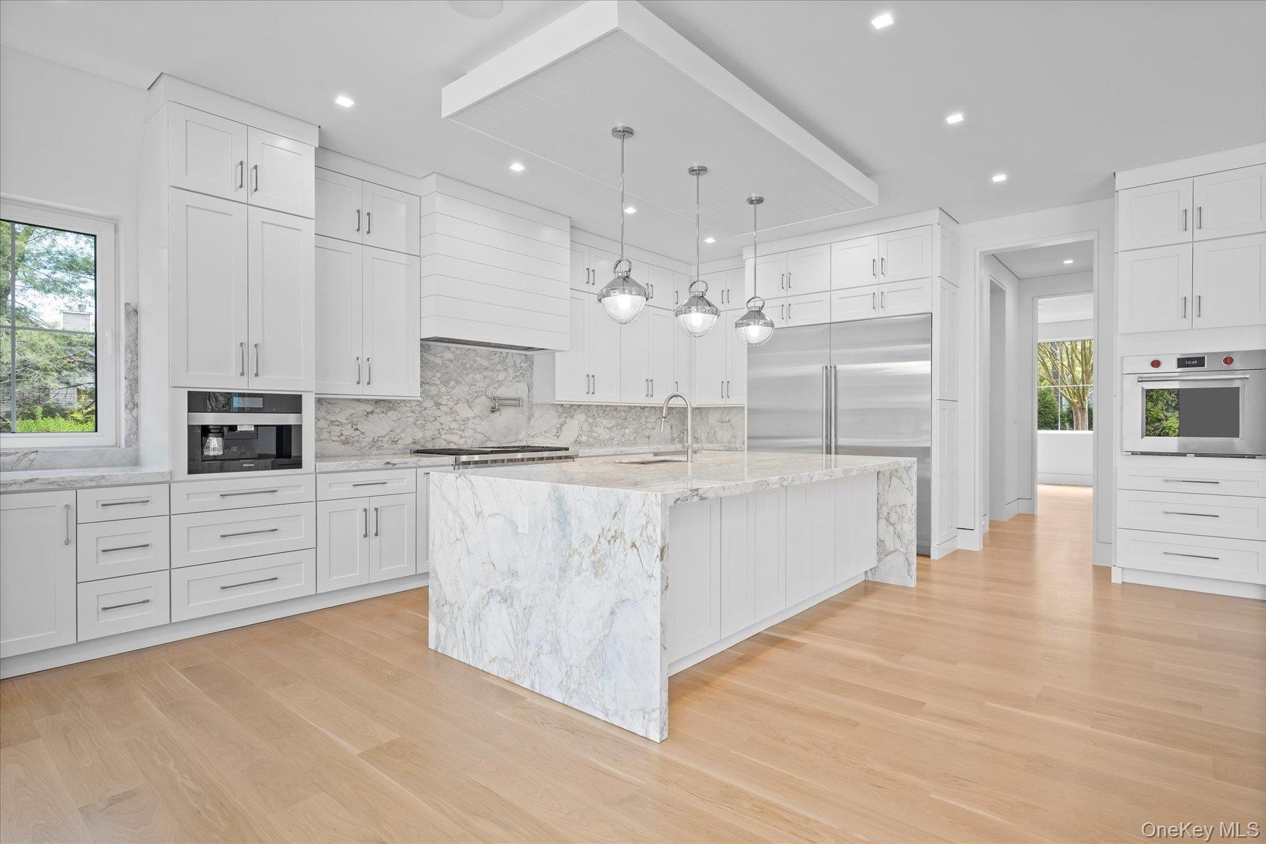 - Kitchen with white cabinetry, premium appliances, and recessed lighting