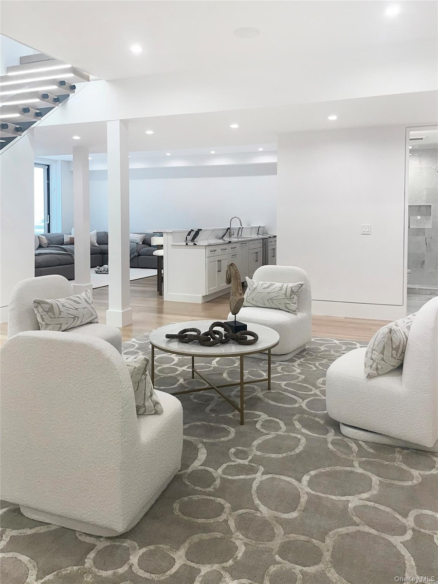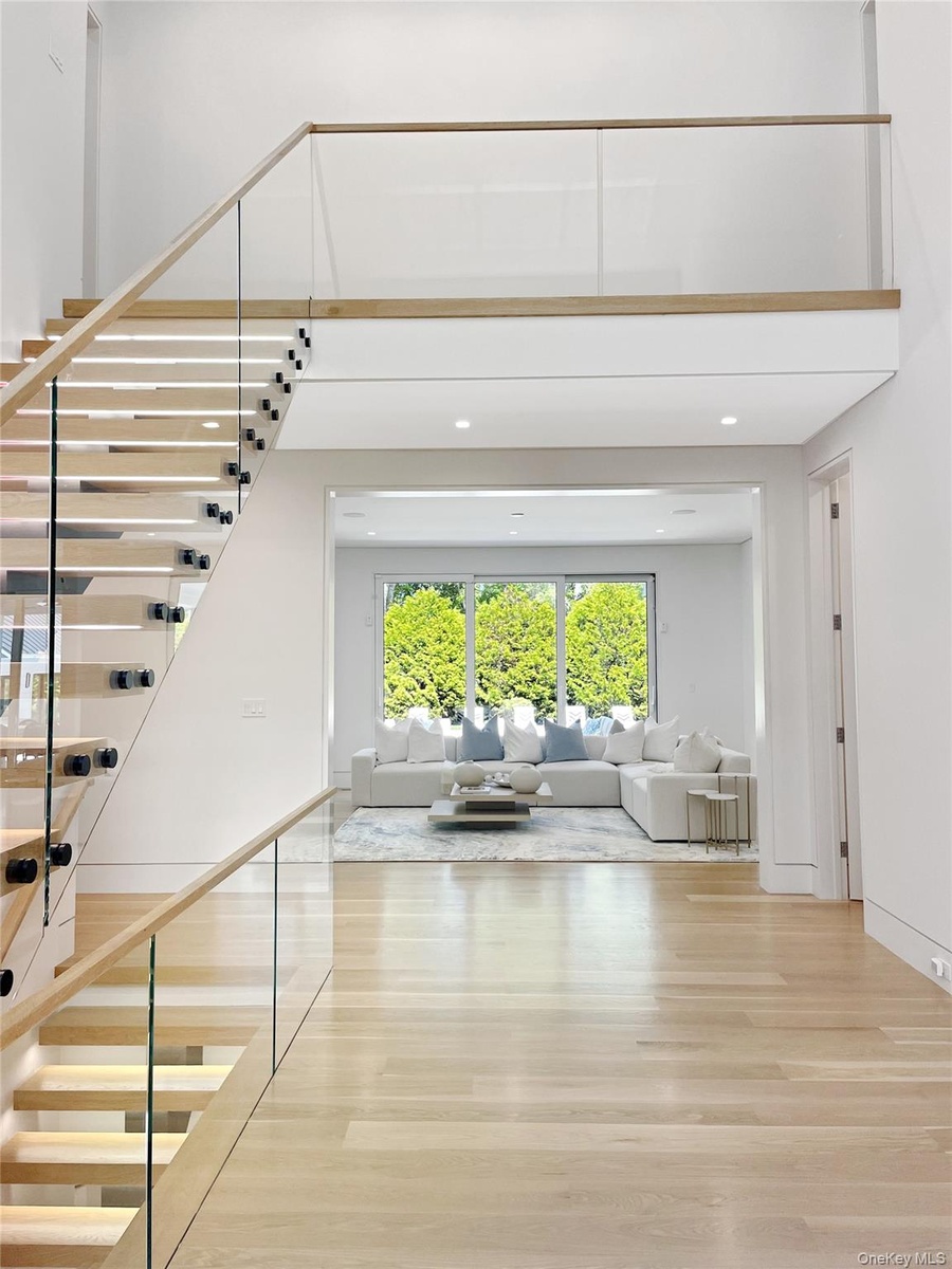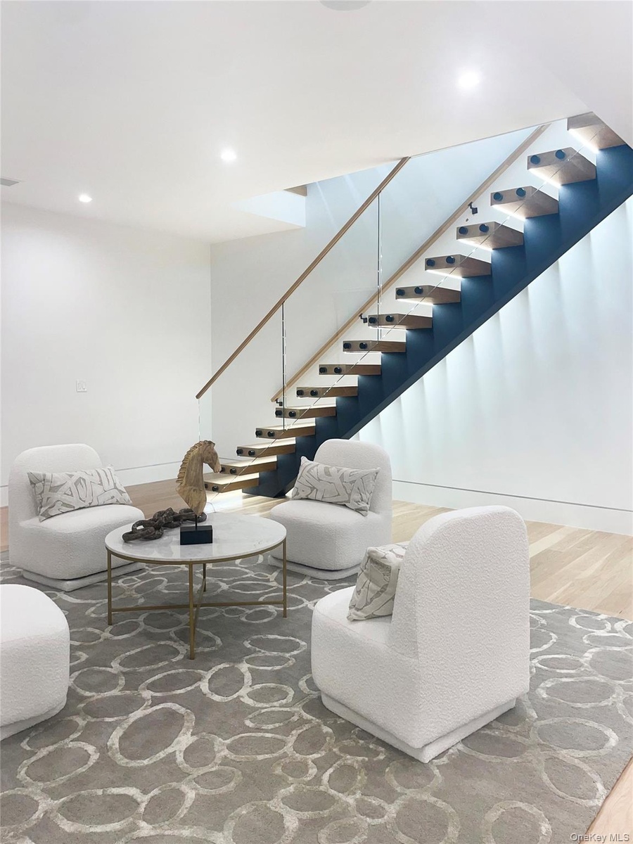 - Living area featuring stairs, wood finished floors, baseboards, and recessed lighting