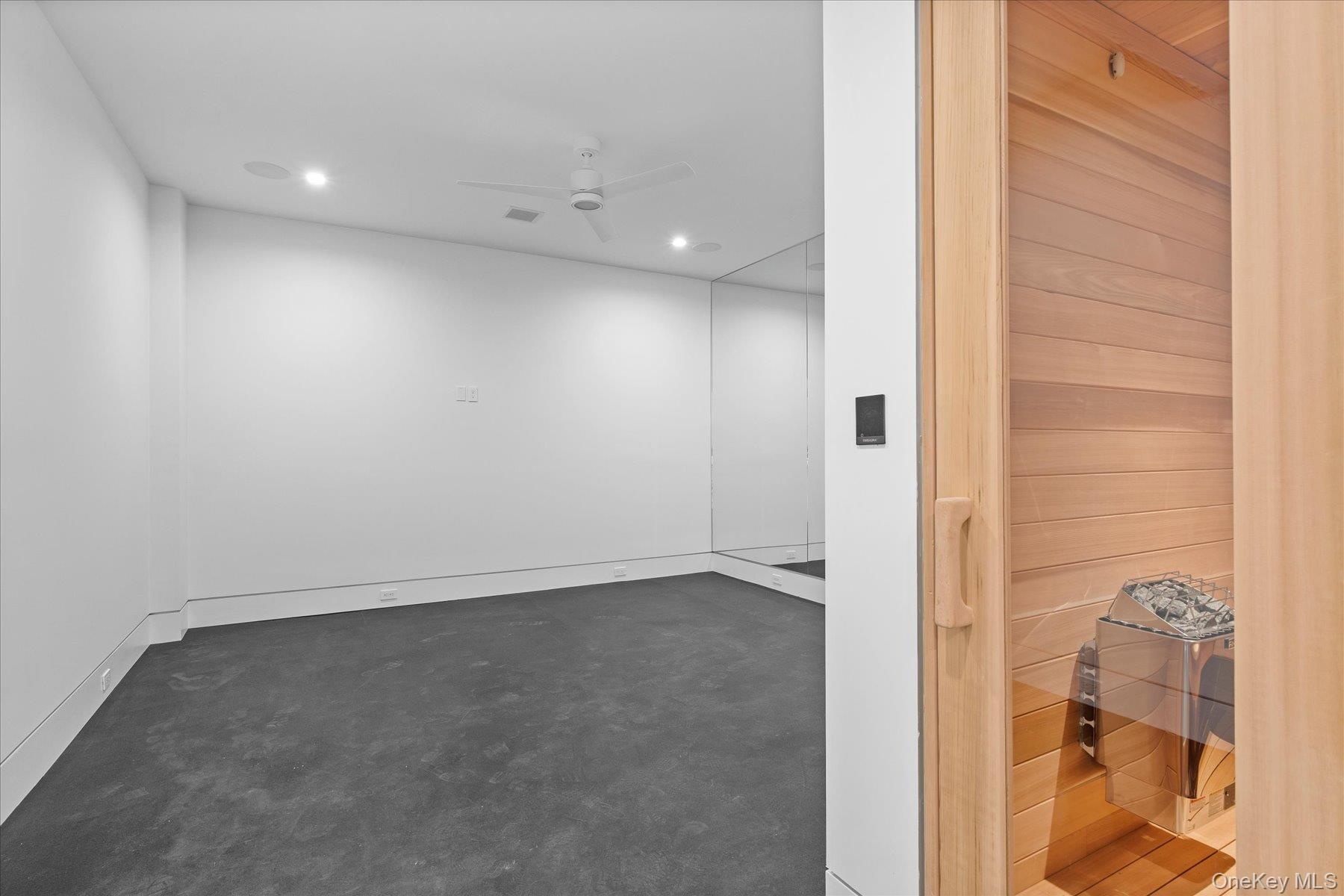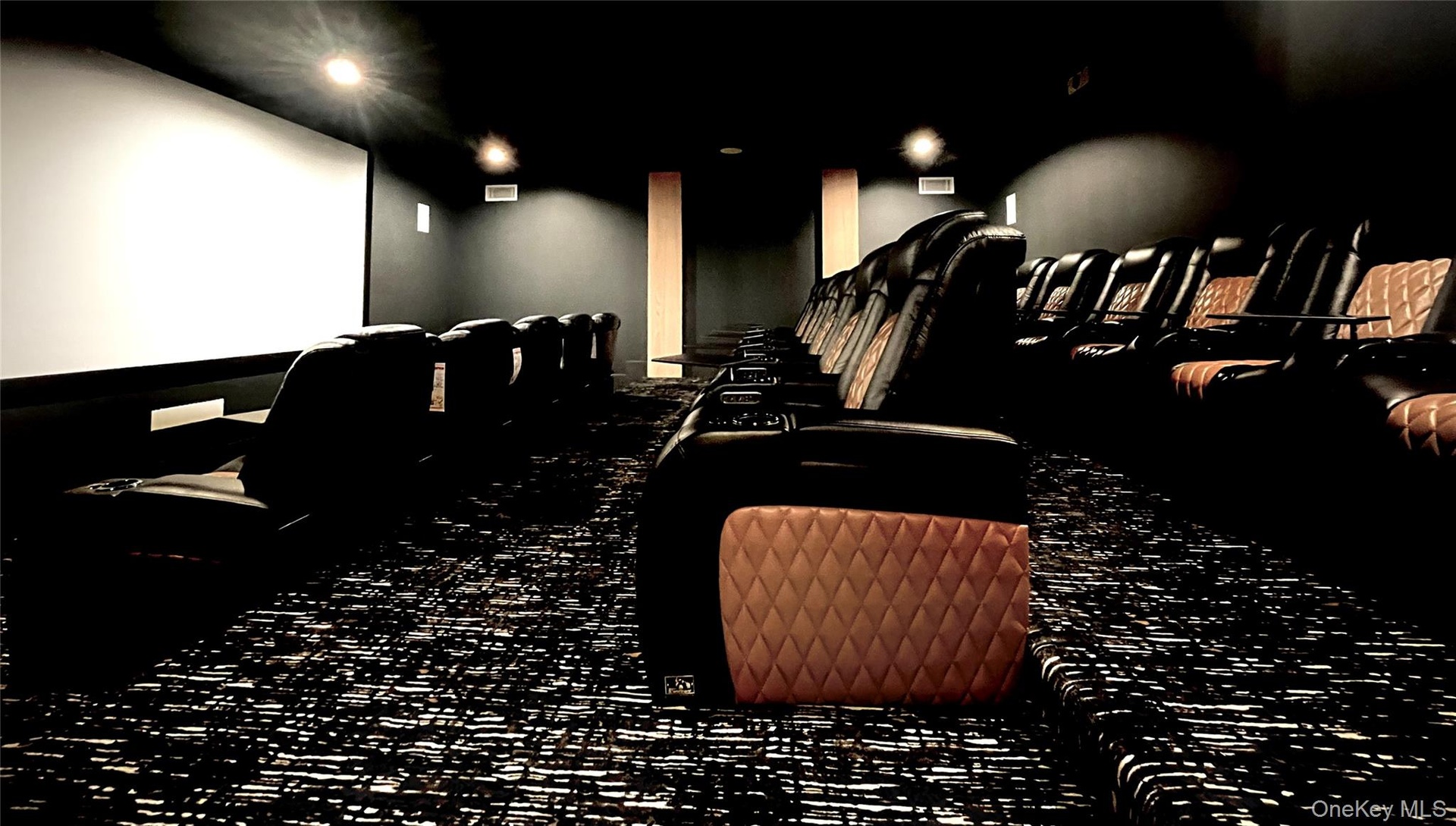The stunning lower level is designed for entertainment and relaxation, featuring a glass-enclosed gym with sauna, a 14-seat sunken movie theater, a recreational area, and two guest bedrooms with a full bath.