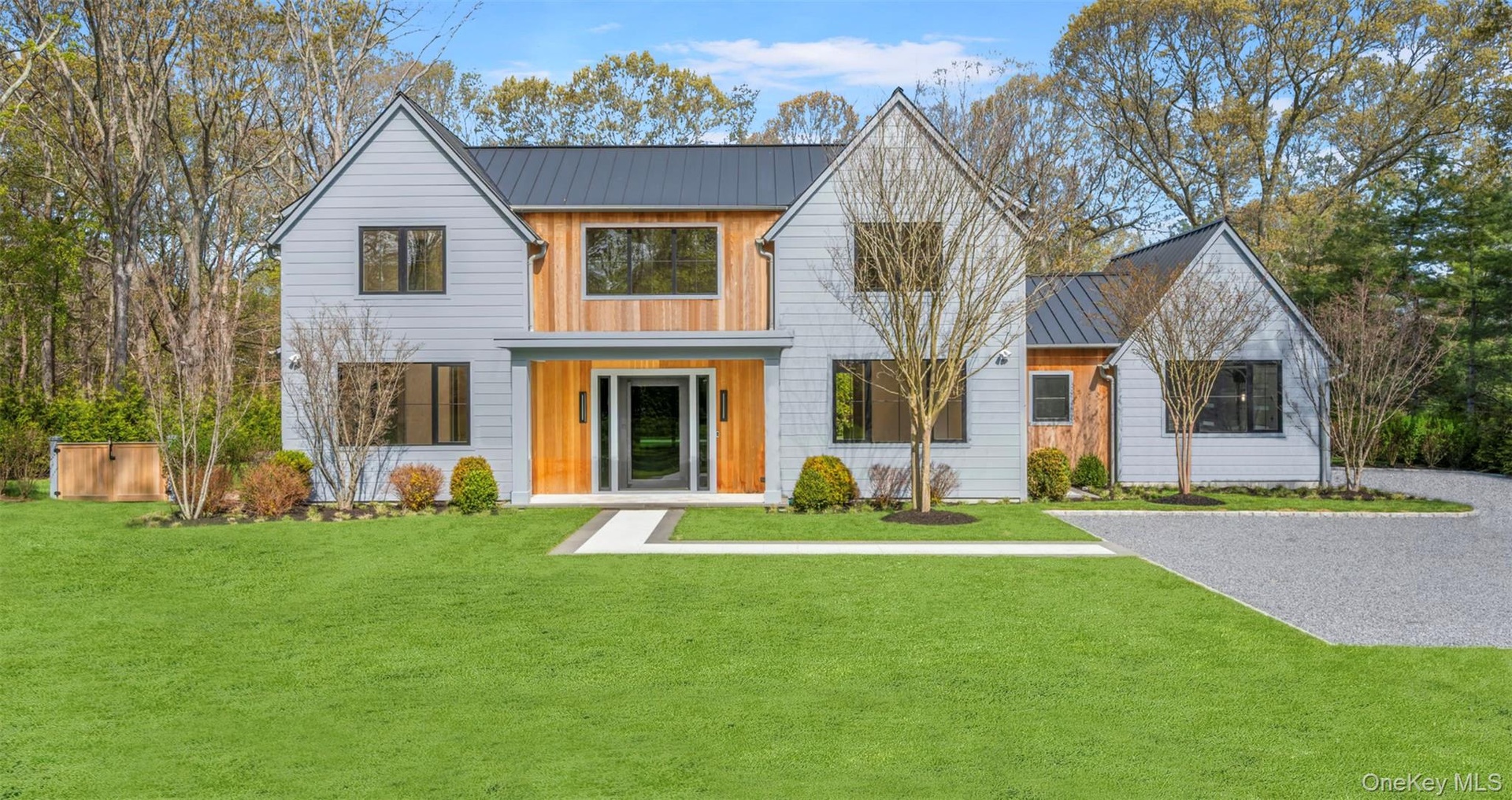 - Modern farmhouse with metal roof, a front yard, a standing seam roof, and driveway