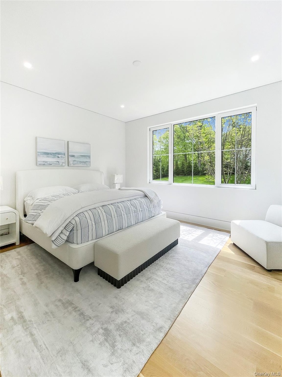 - Bedroom featuring multiple windows, wood finished floors, and recessed lighting