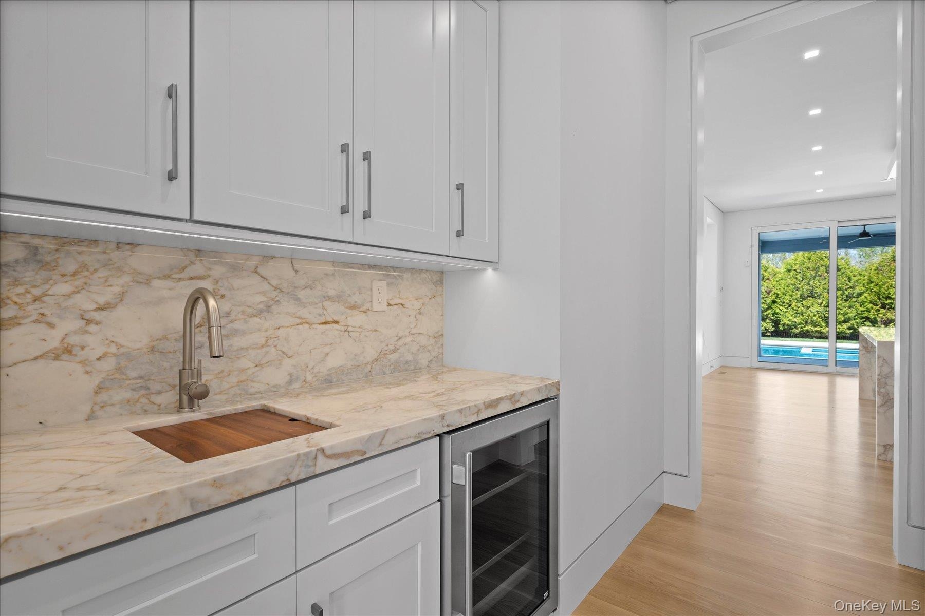 - Bar with wine cooler, light wood-style flooring, a sink, wet bar, and tasteful backsplash