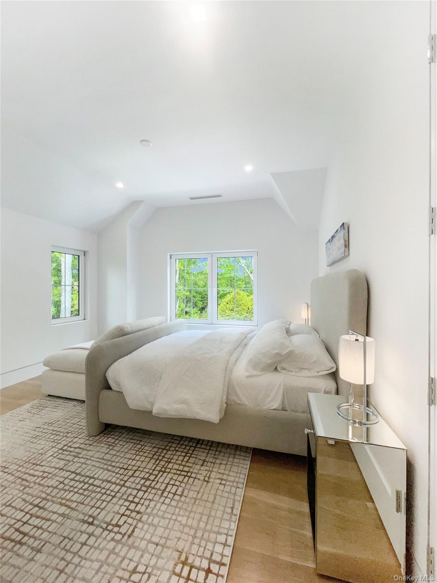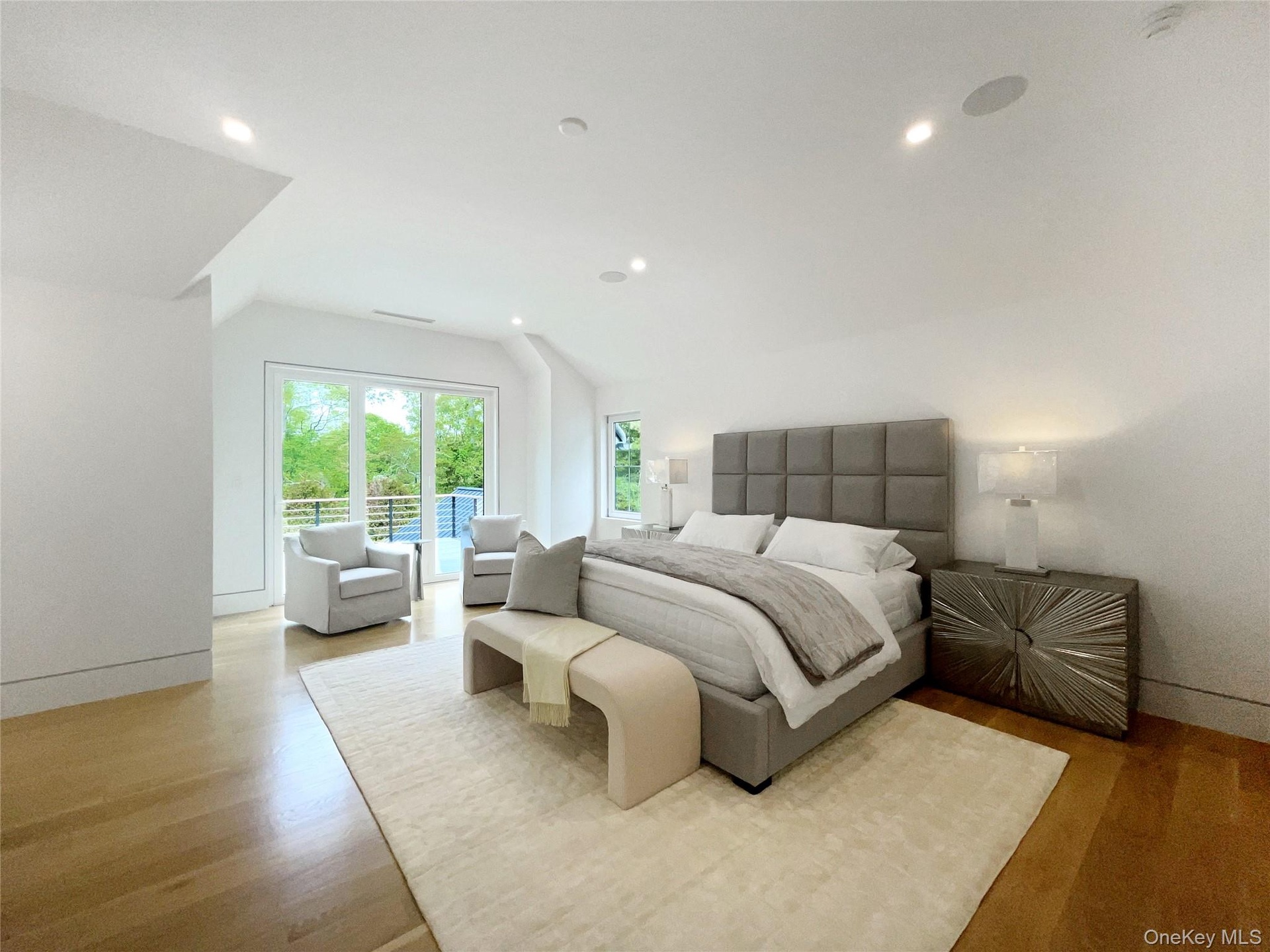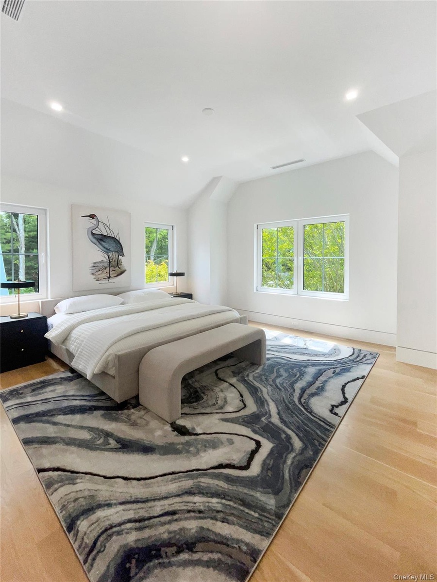 - Bedroom with wood finished floors, vaulted ceiling, and recessed lighting