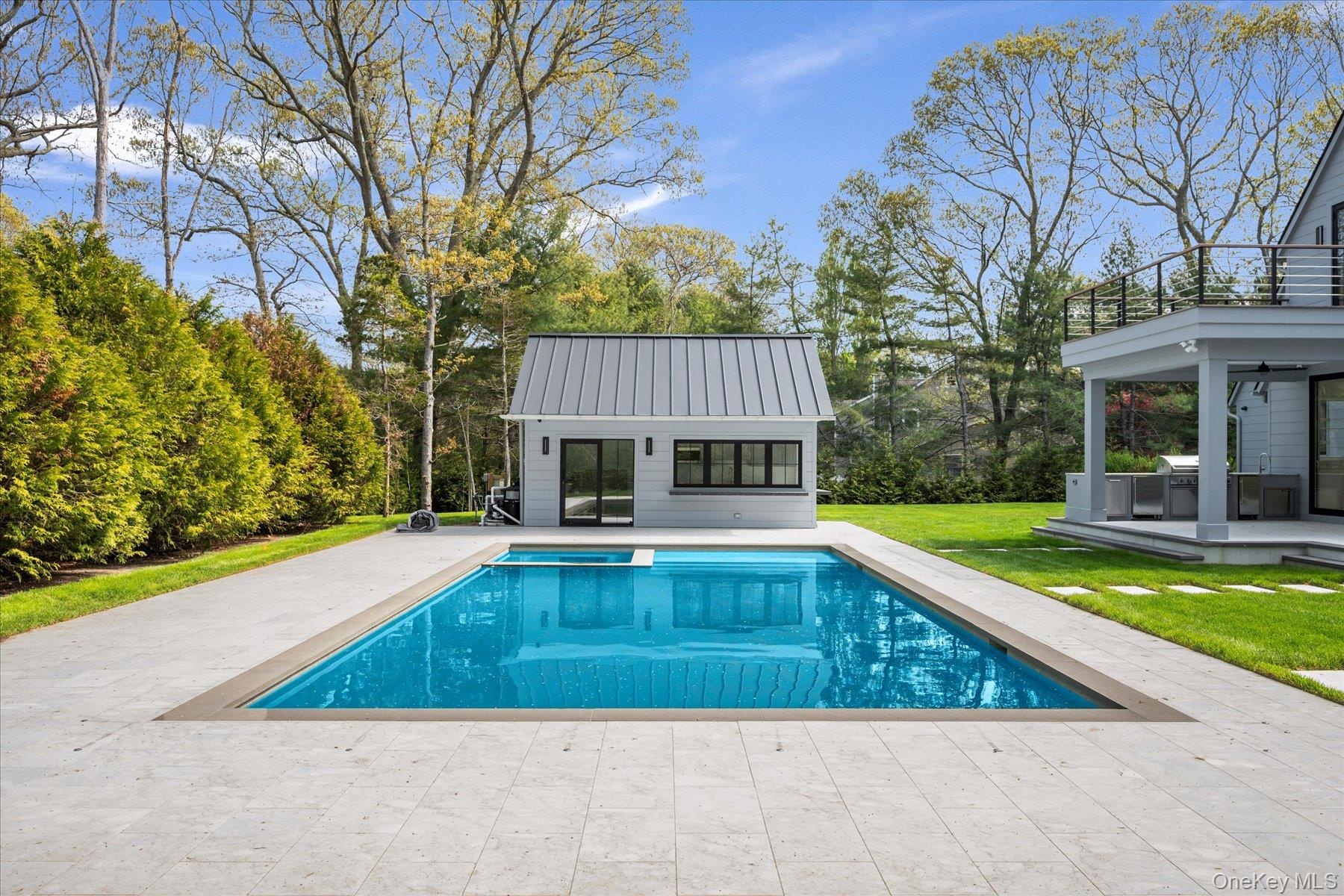 - Outdoor pool with an outdoor hangout area, a patio area, an outbuilding, a storage structure, and a lawn
