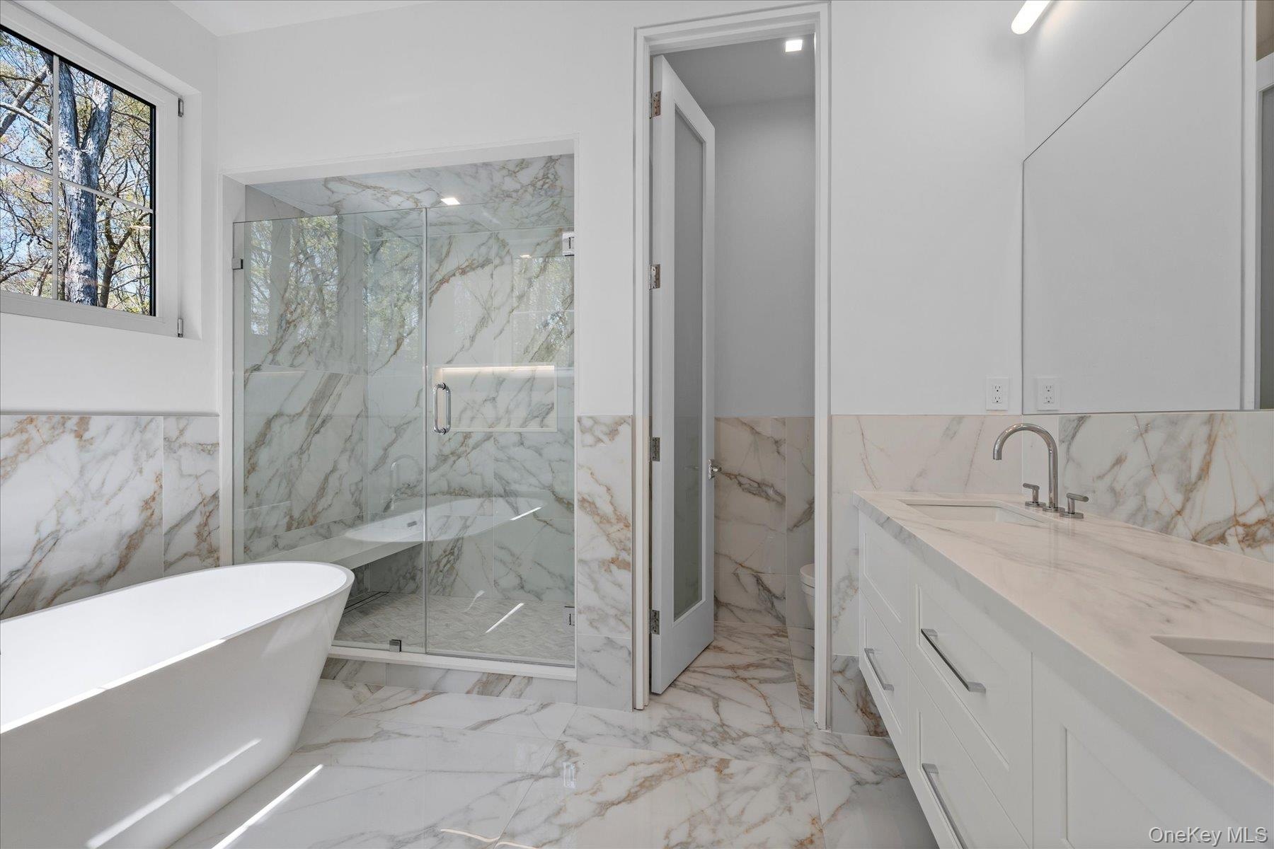 - Full bath with a marble finish shower, tile walls, a freestanding bath, and a sink