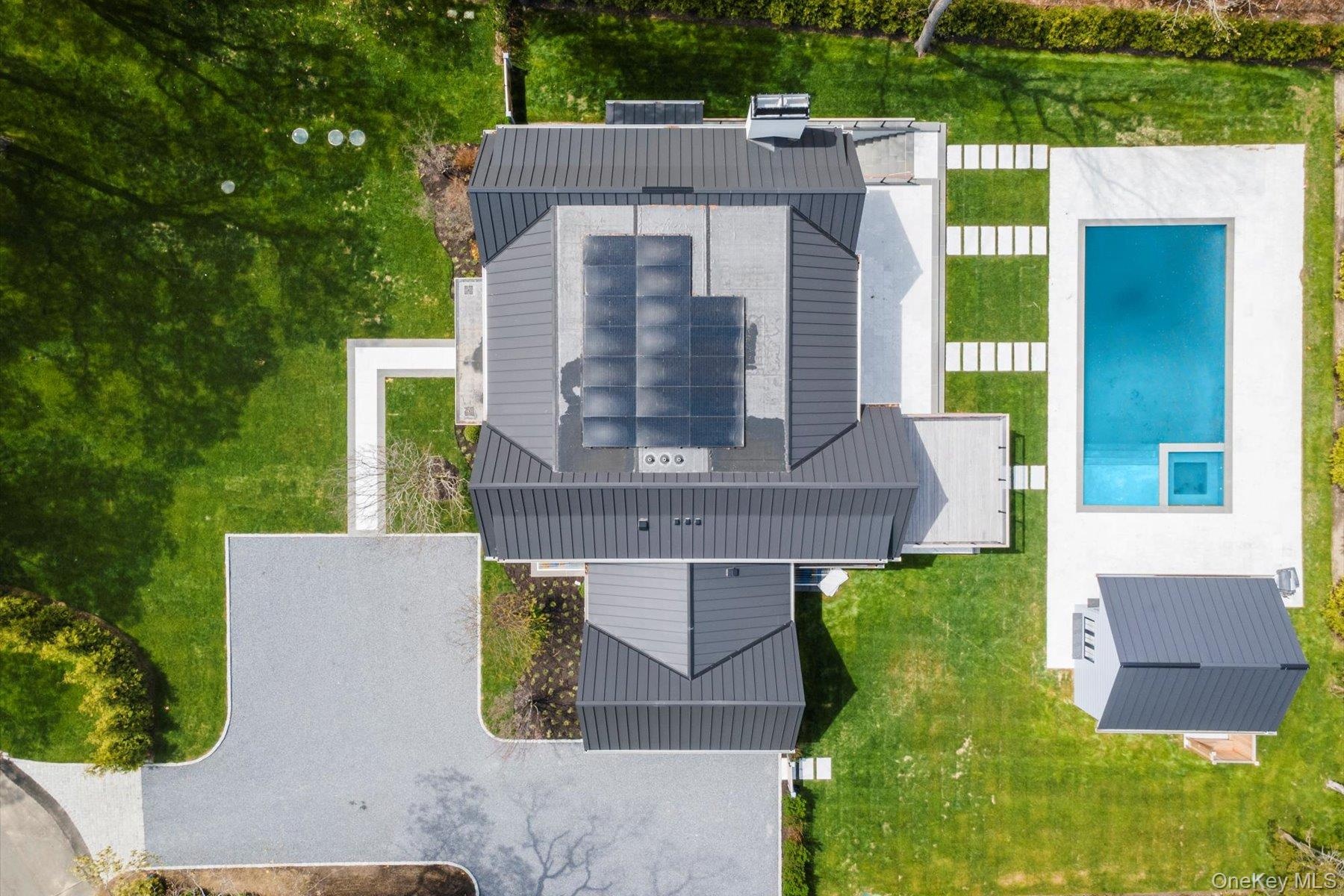 The sprawling backyard is a private oasis, showcasing a 20 x 40 heated Gunite saltwater swimming pool and spa, all surrounded by a Turkish marble patio nestled within lush landscaping. A fully equipped pool house enhances the outdoor experience, complete with a living room, kitchenette, bathroom, laundry, outdoor shower, grill area, and a walk-up serving counter—ideally suited for entertaining.