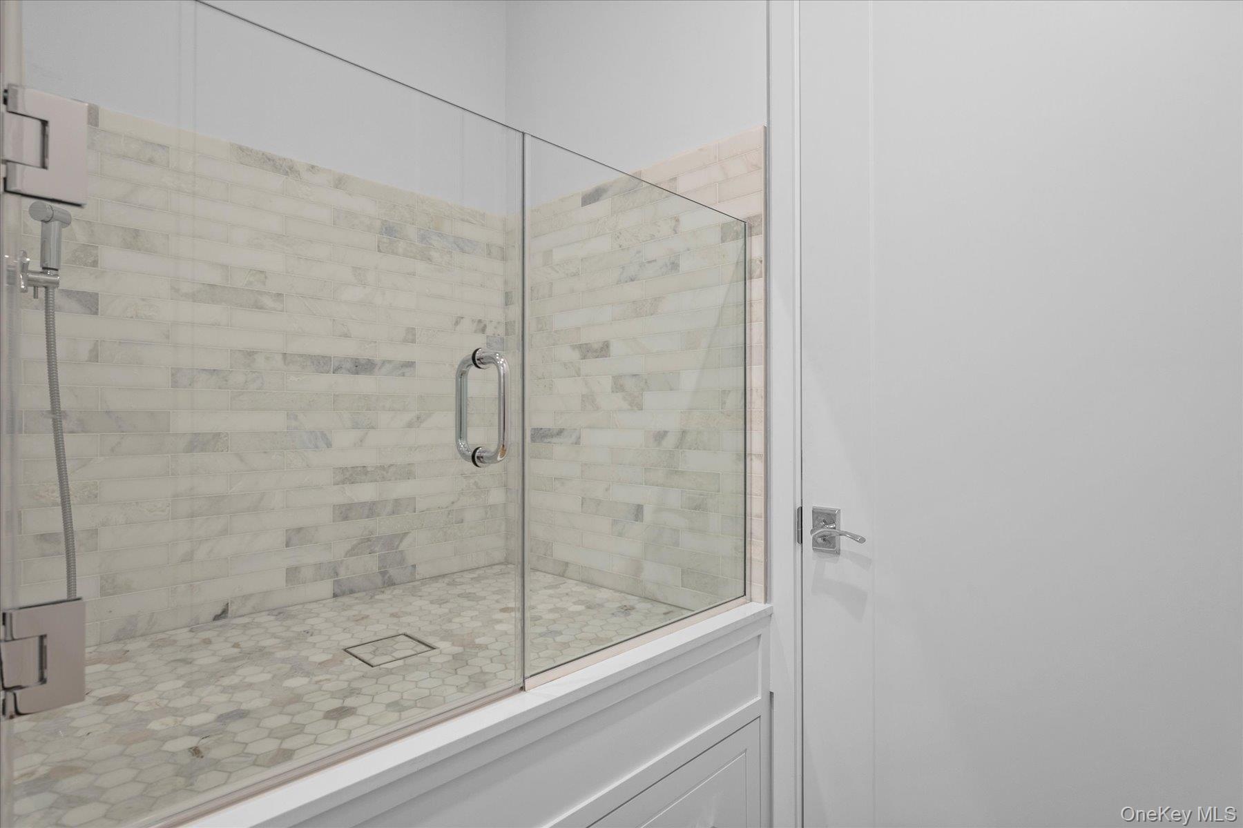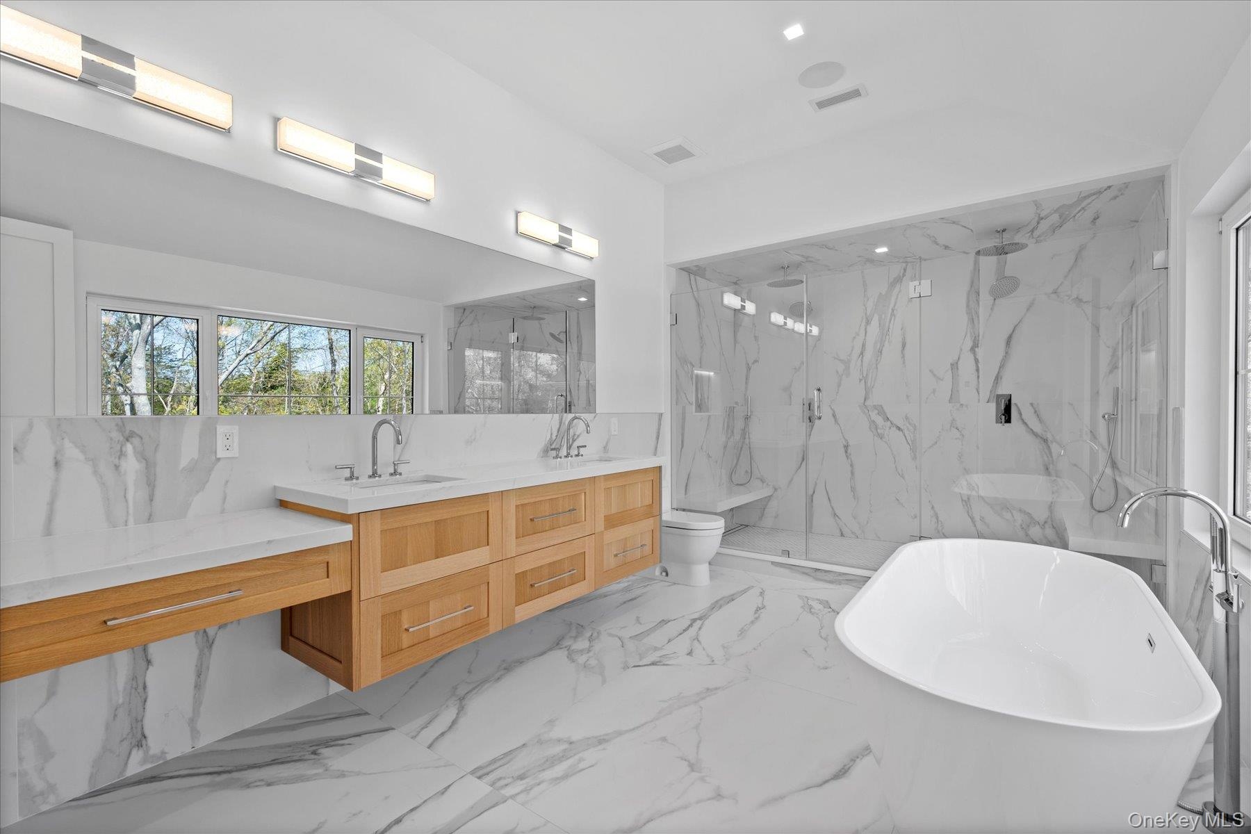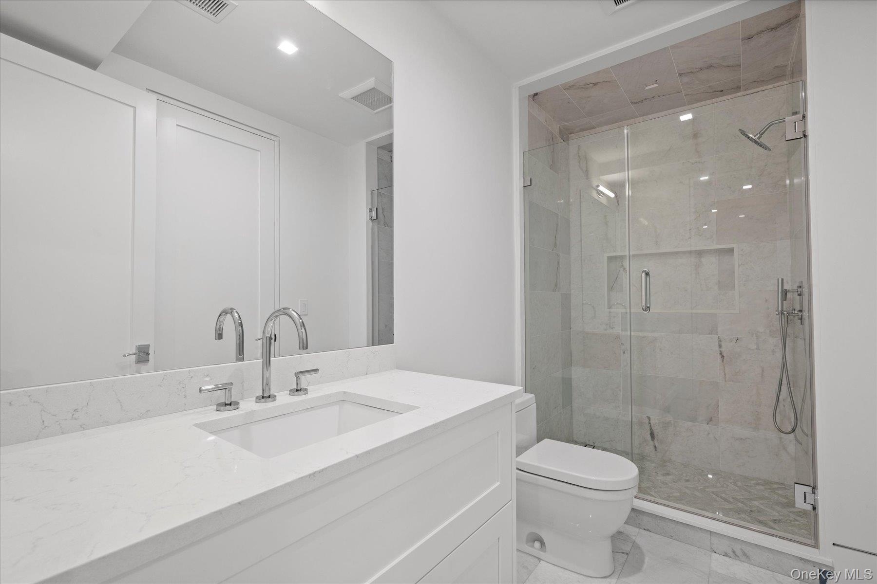 - Full bathroom with a stall shower, vanity, toilet, and marble finish floor